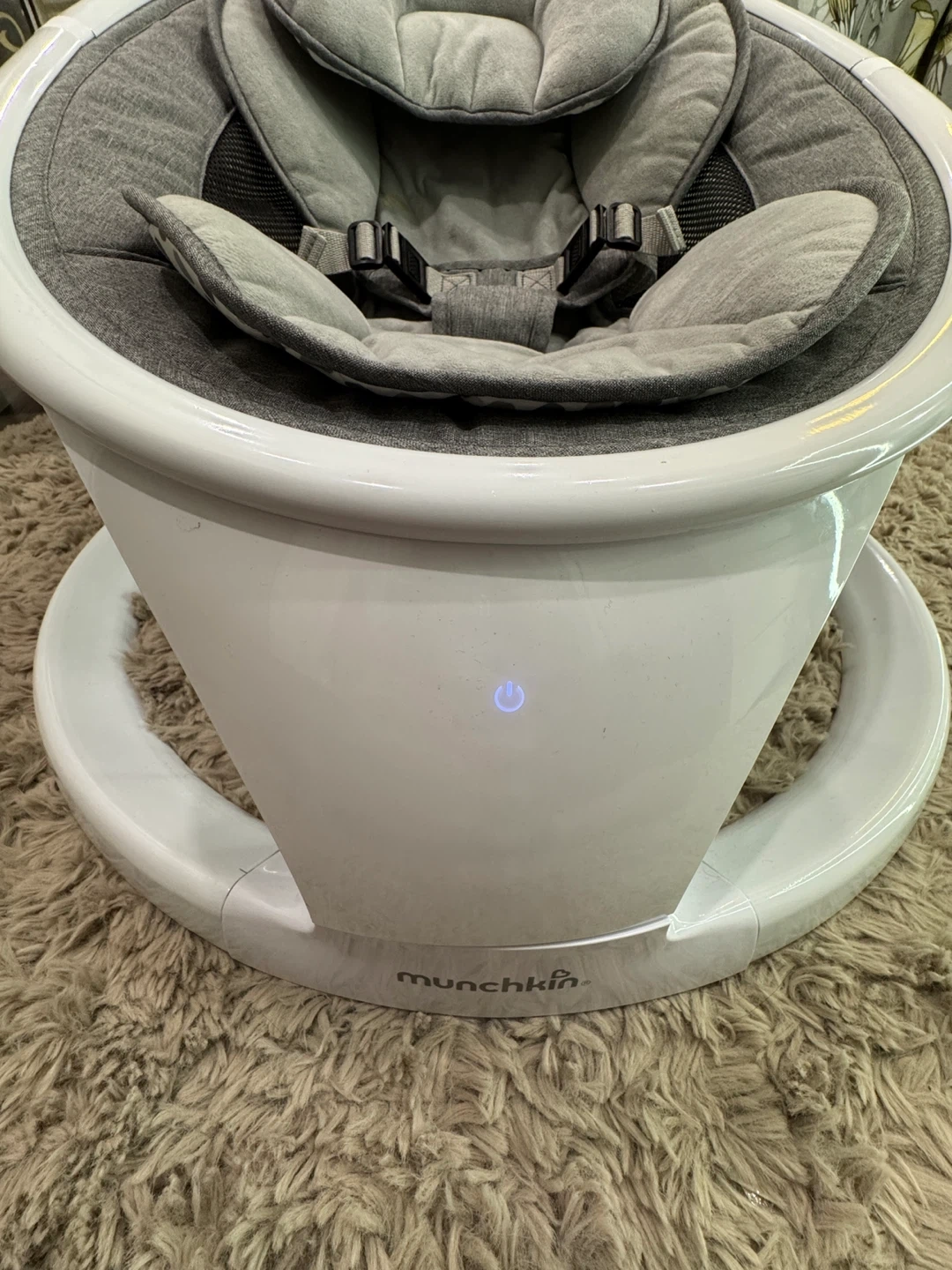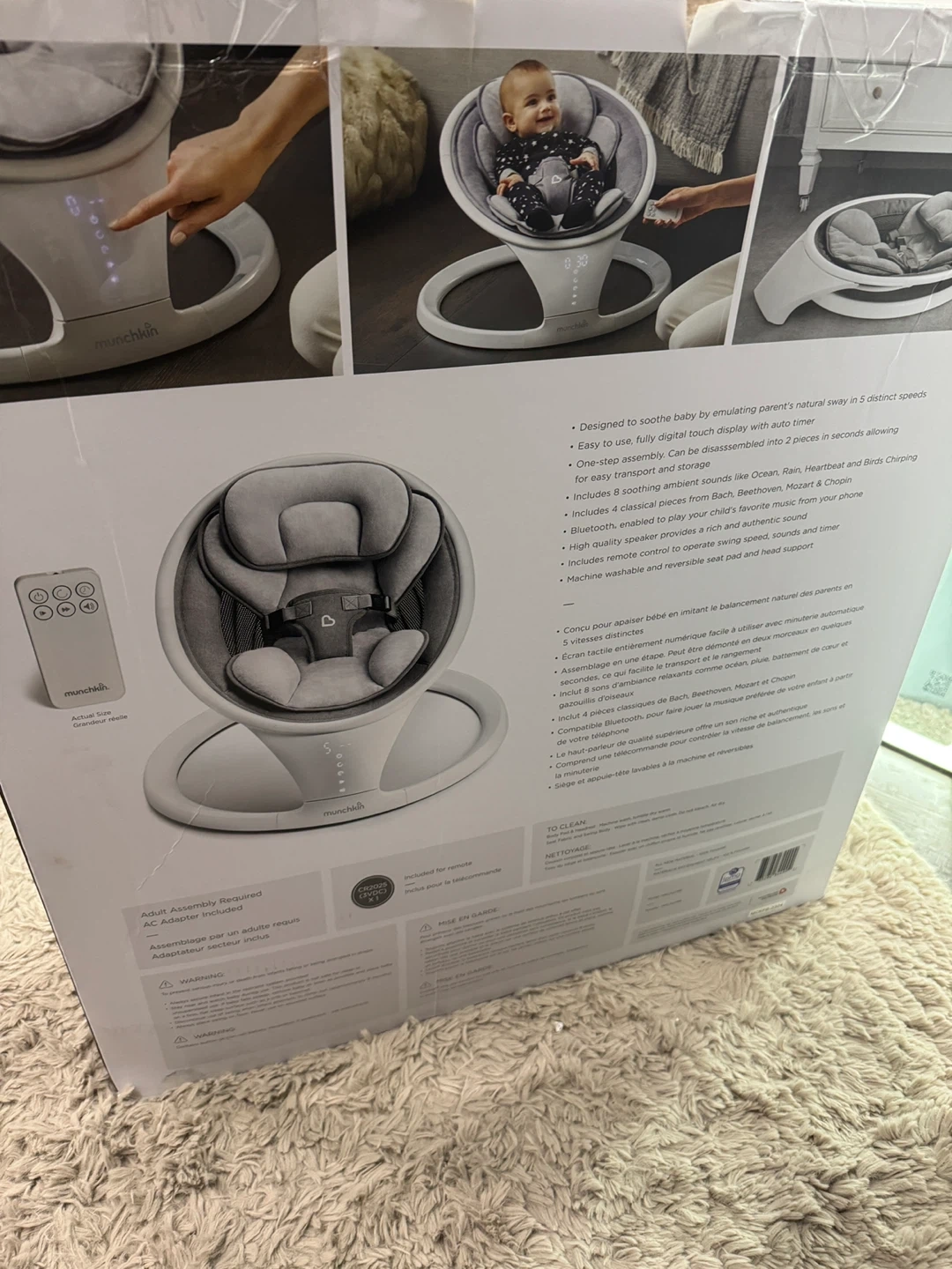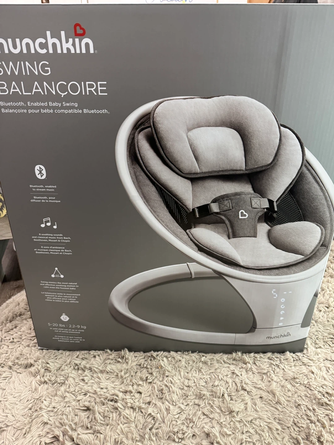 10Selling a Munchkin Bluetooth Enabled Baby Swing in great condition! This swing is designed to soothe your baby by emulating parental movements in five speeds. Key features include: - Easy to use, fully digital touch display - One-step assembly - Folds flat for easy travel and storage - Includes 8 ambient sounds like Ocean, Rain, Heartbeat and Birds Chirping - Bluetooth enabled to play your child's favourite songs from your phone - High-quality speaker provides clear sound - Includes remote to operate swing speed, sound and timer - Machine washable and reversible seat pad and head support