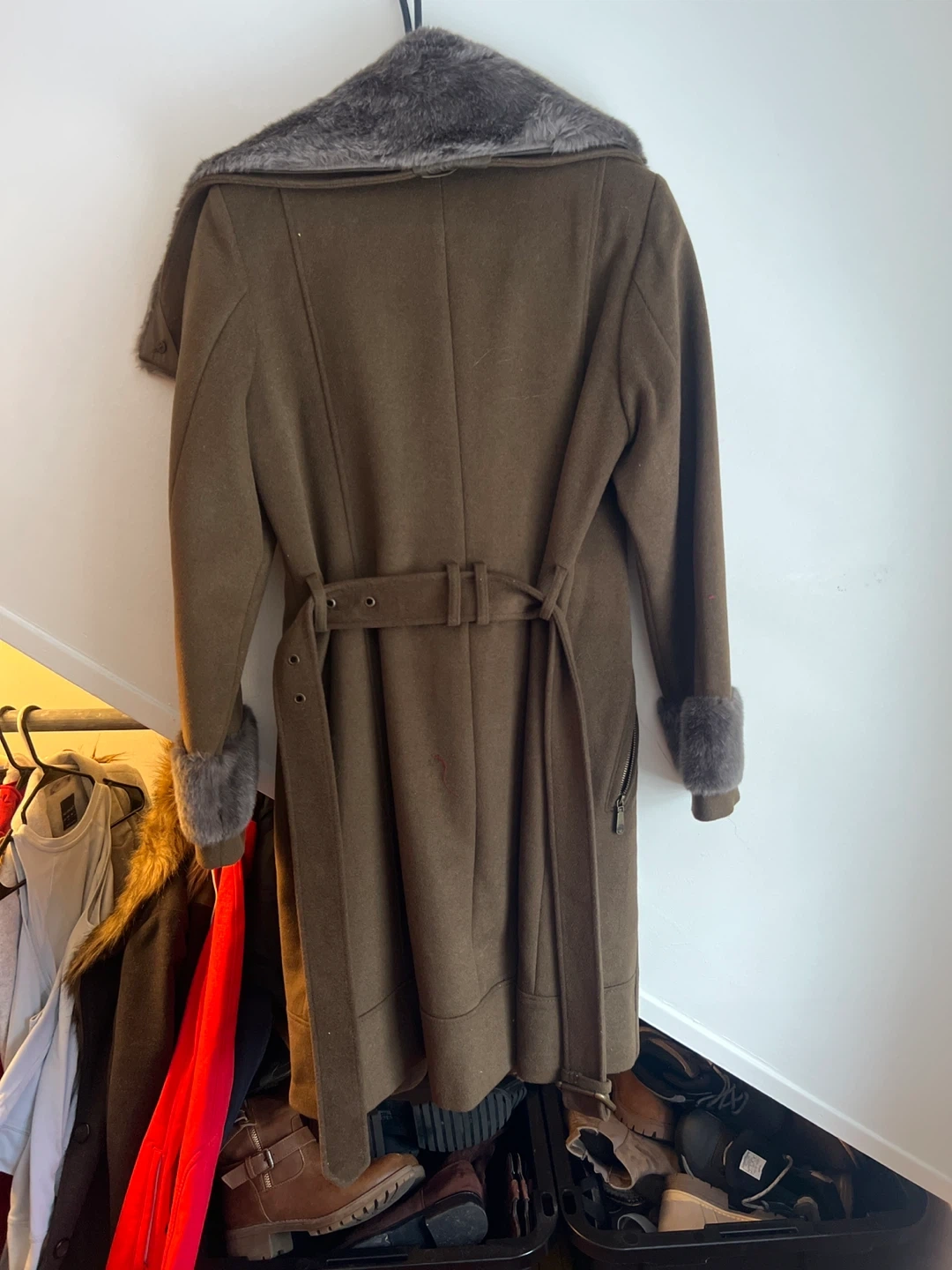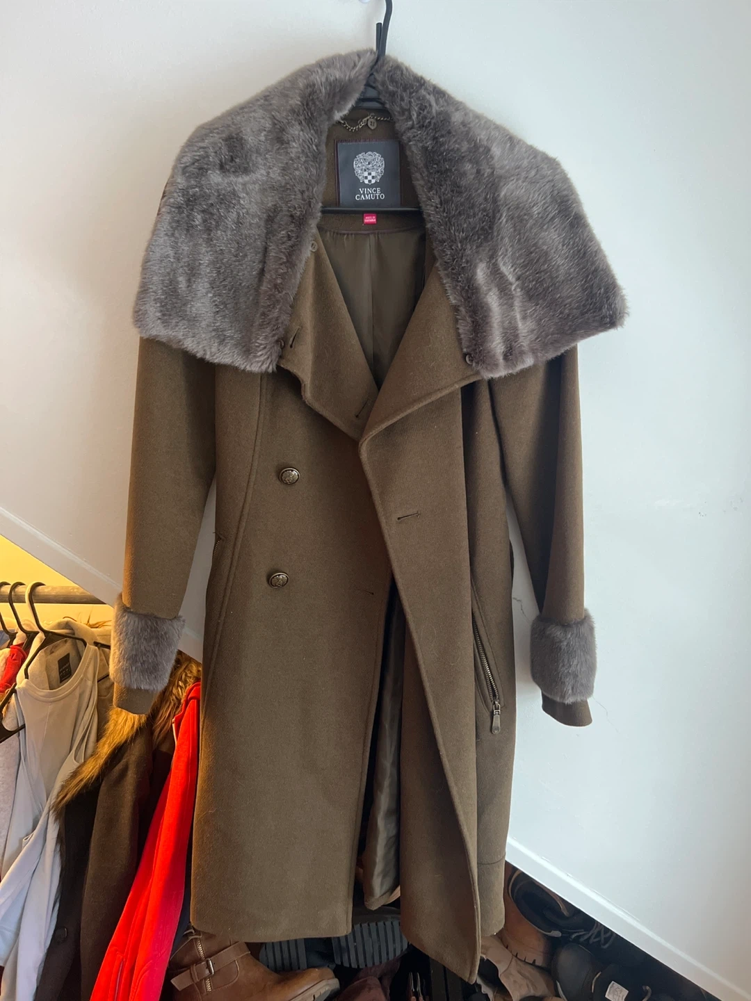 This Vince Camuto wool blend coat features a cozy faux fur collar and cuffs. It's a size medium and comes with a belted waist for a flattering fit. A stylish and warm