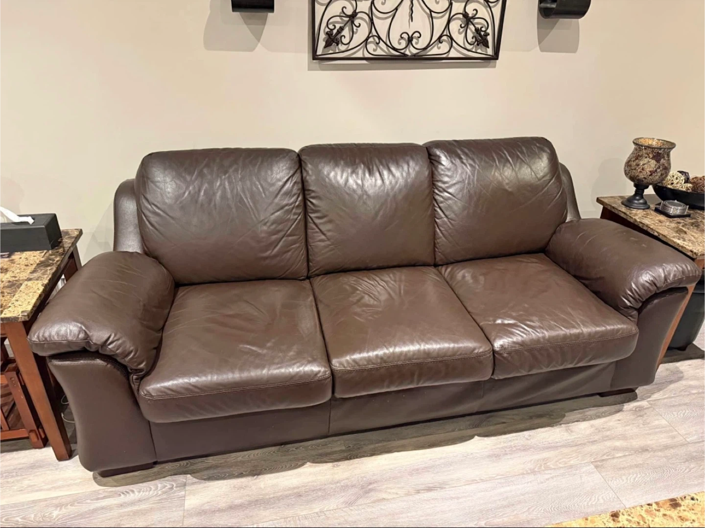 Selling 2 full size couches made of real genuine leather. Beautiful brown colour that adds a warm, classic look to any space.
