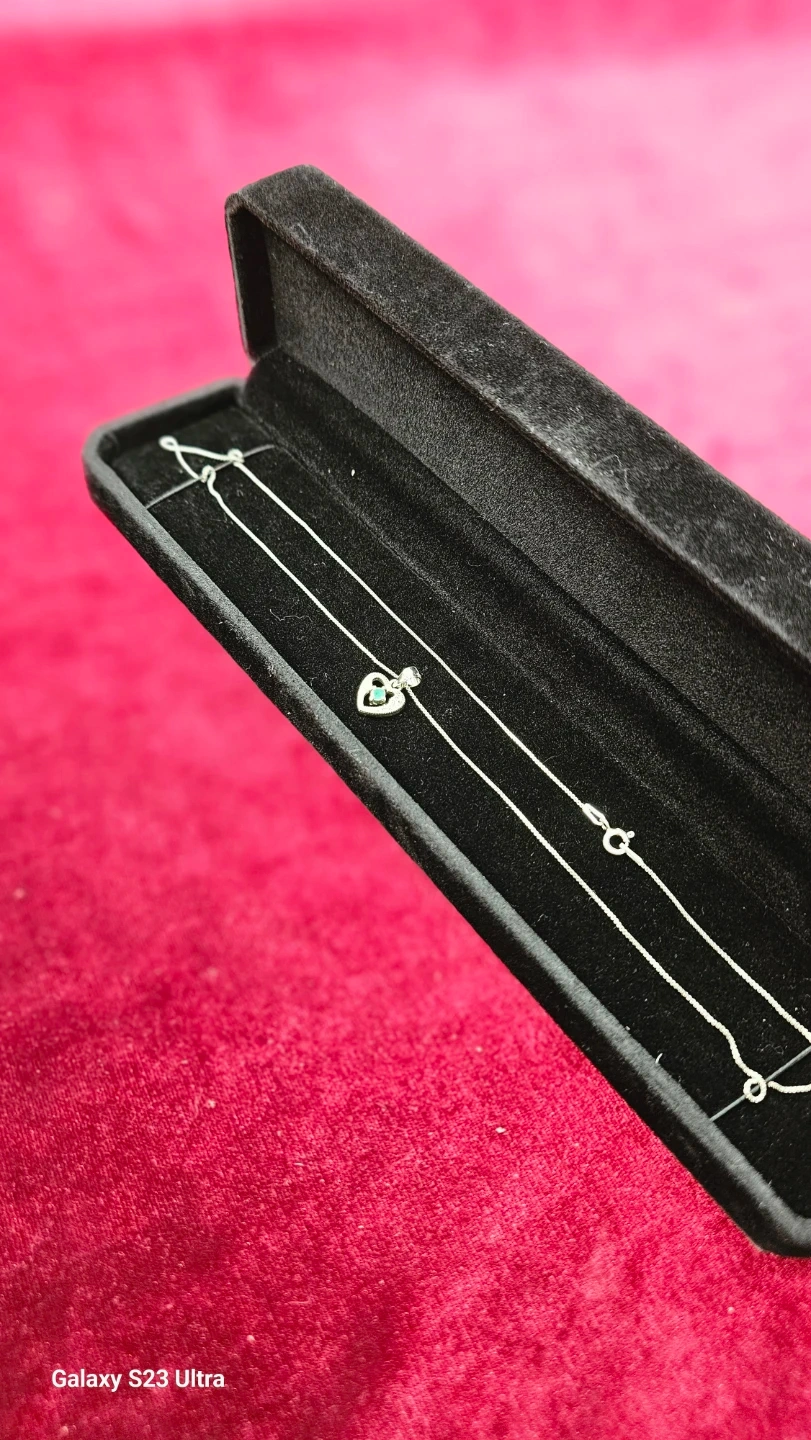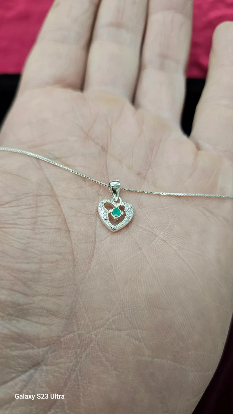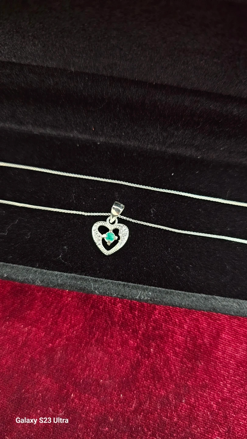 Selling a delicate heart pendant necklace. It features a silver chain and a heart-shaped pendant with a small green emerald at the center. It comes in a box, perfect for gifting or keeping it safe when not in use