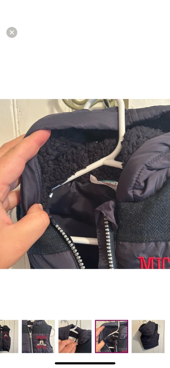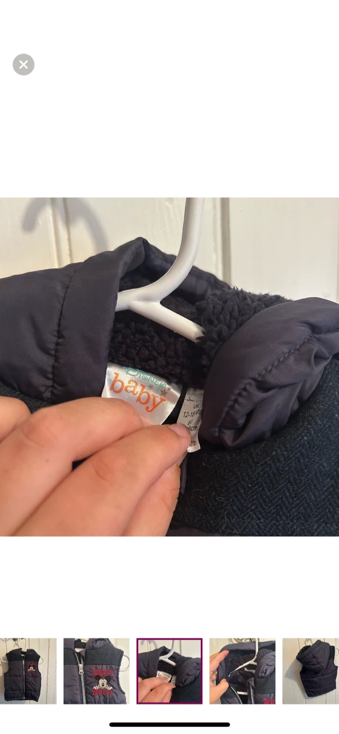 Disney brand. Zip up puffer vest. Navy blue with embroidered Mickey graphic. Size 12/18m. Brand new condition