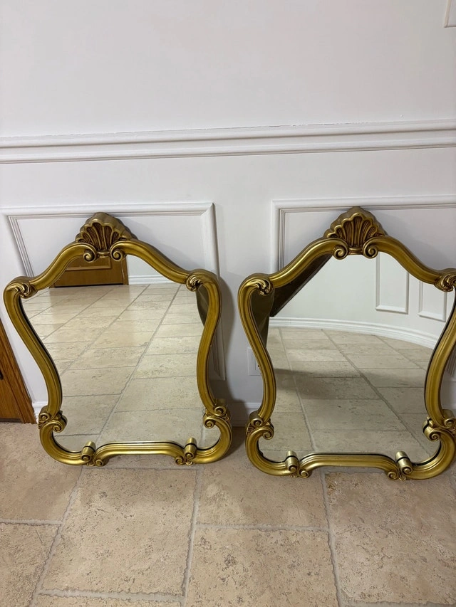 Enhance your home decor with these elegant, used wall mirrors, each measuring 34 inches in height and 25 inches in width, featuring ornate gold frames. These mirrors are in good condition, ready to add a touch of classic charm to any room. Dimensions: 34" x 25". Frame Material: ornate gold. Cash accepted.
