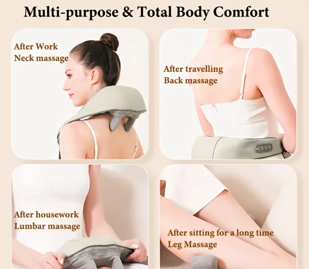 This is a multi-purpose massager that can provide total body comfort! It's great for neck, shoulder, back, waist and leg massage. It comes with a user manual and charger cable.