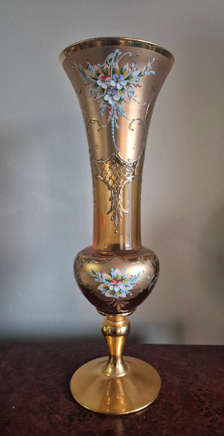 Beautiful Murano glass vase with 24 KT gold paint detailing. It has a floral design and intricate gold lattice work. Stands about 12" tall. pickup Edmonton Clareview area or I can bring it to my work in sherwood park Emerald hills area.