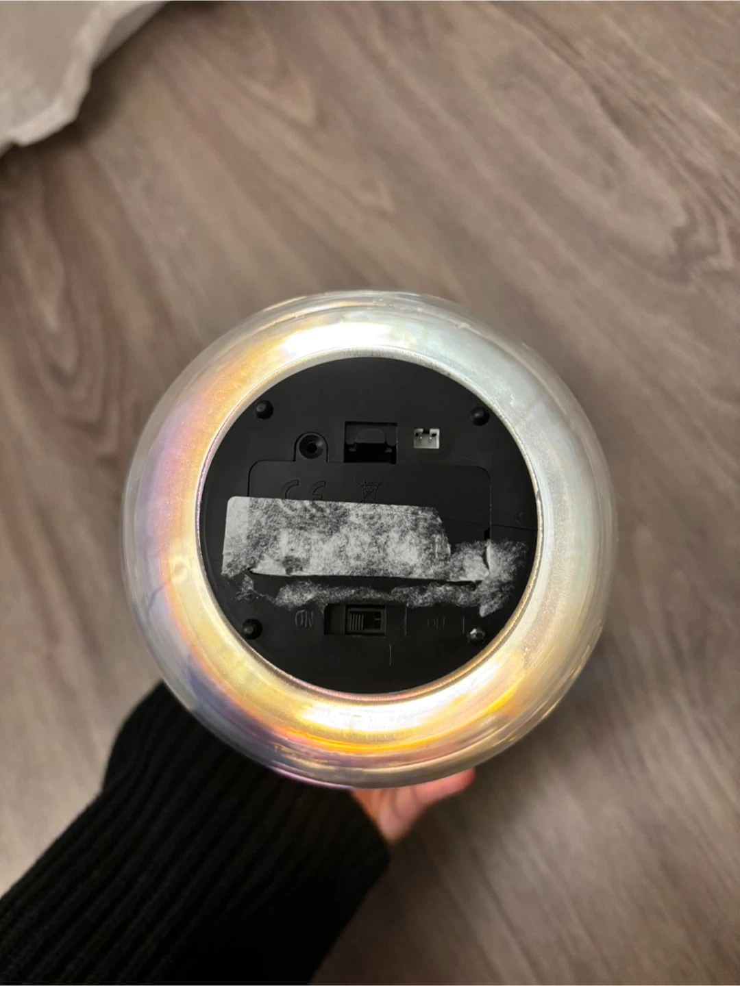 76A glass construction table lamp with an iridescent finish that casts a warm glow, powered by batteries, so no need to plug it in! * Glass construction * Battery powered