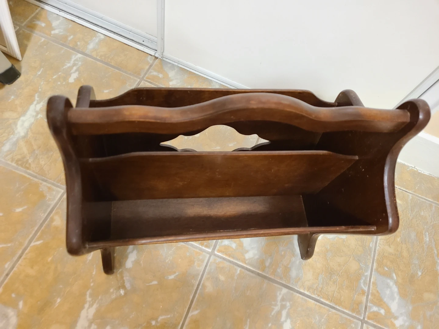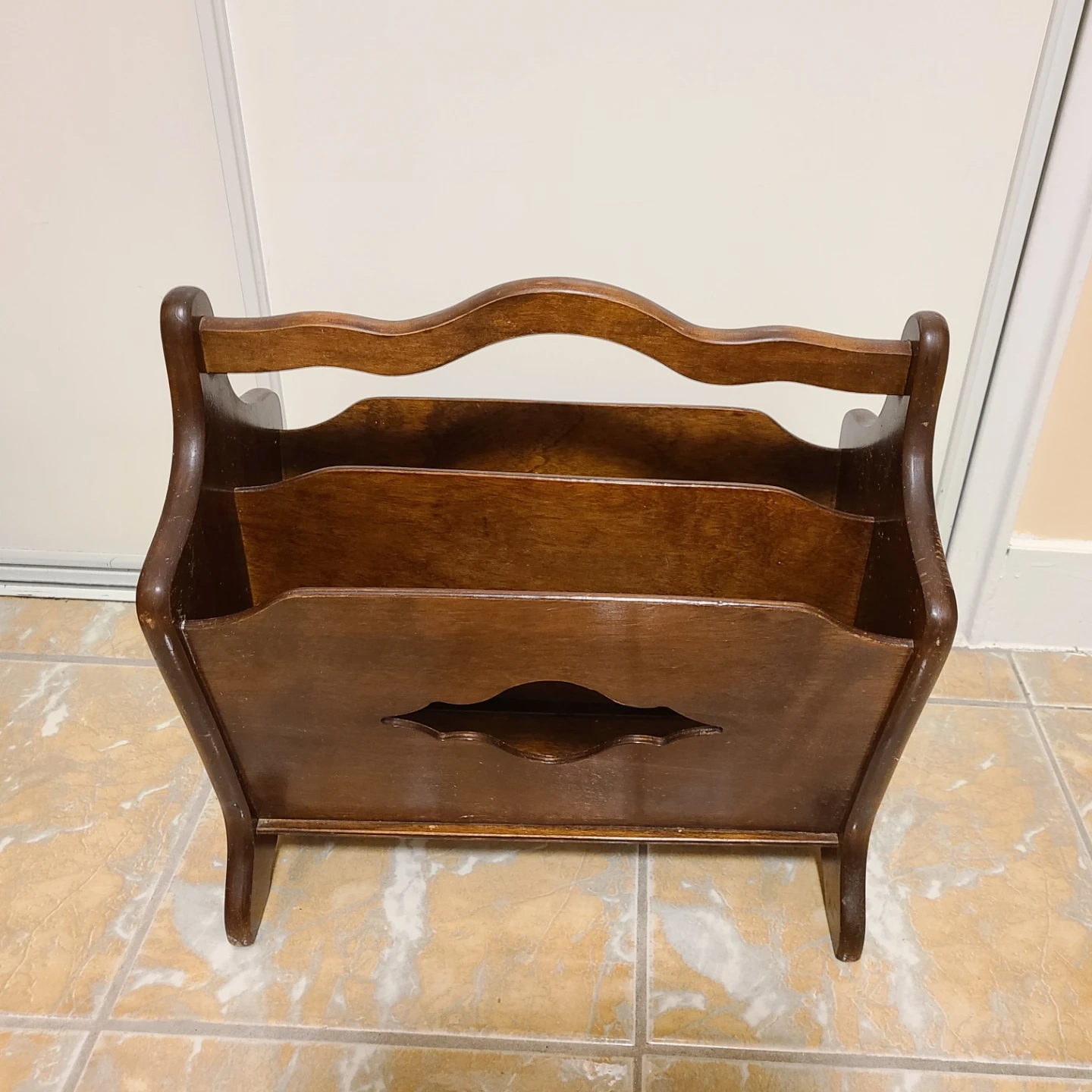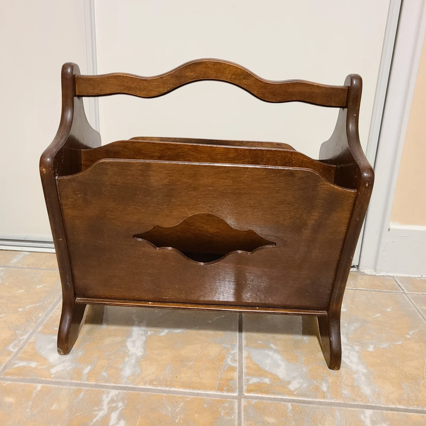 Dark wooden magazine rack with a carved design and a curved handle at the top.