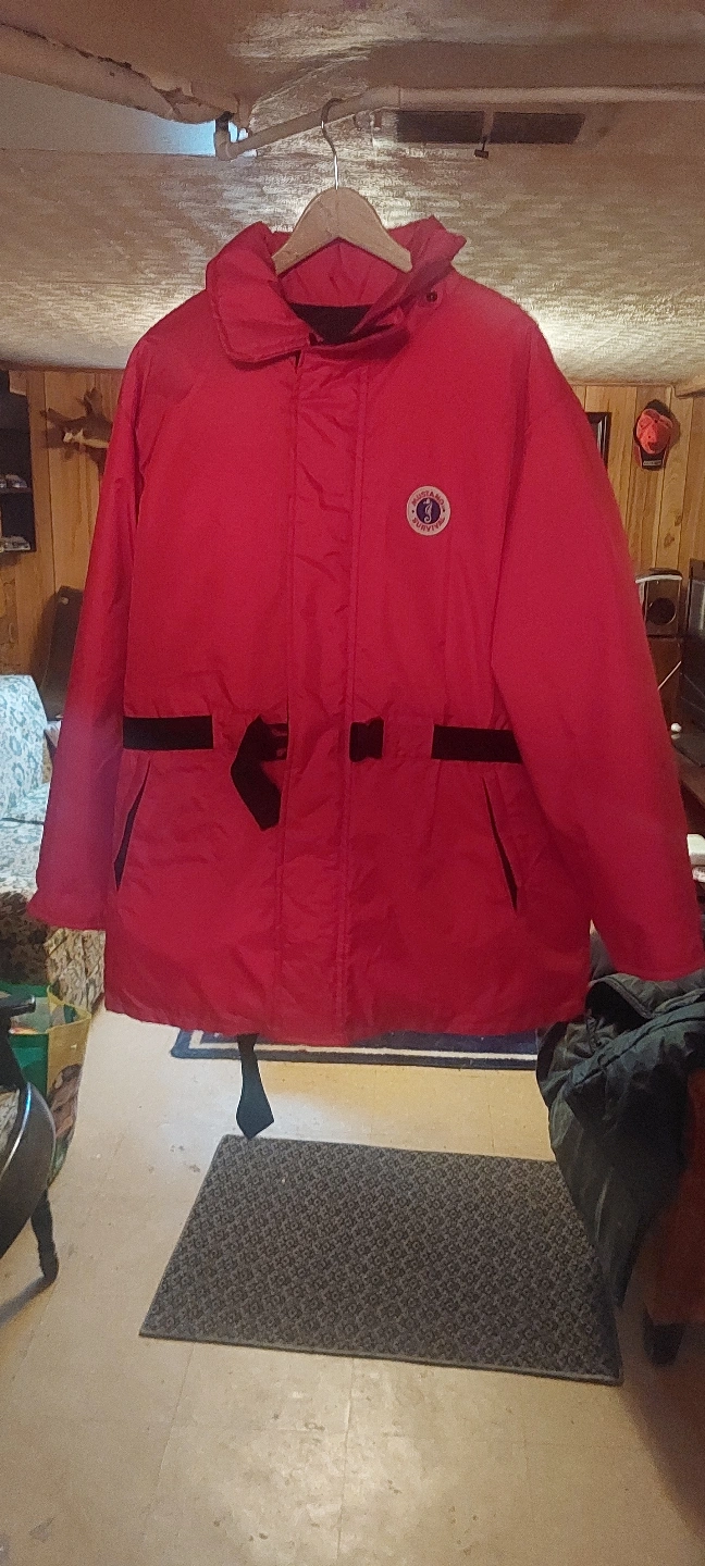 18Red hooded puffer jacket. Features a black waist tie and a Mustang Survival logo. Great for cold weather.
