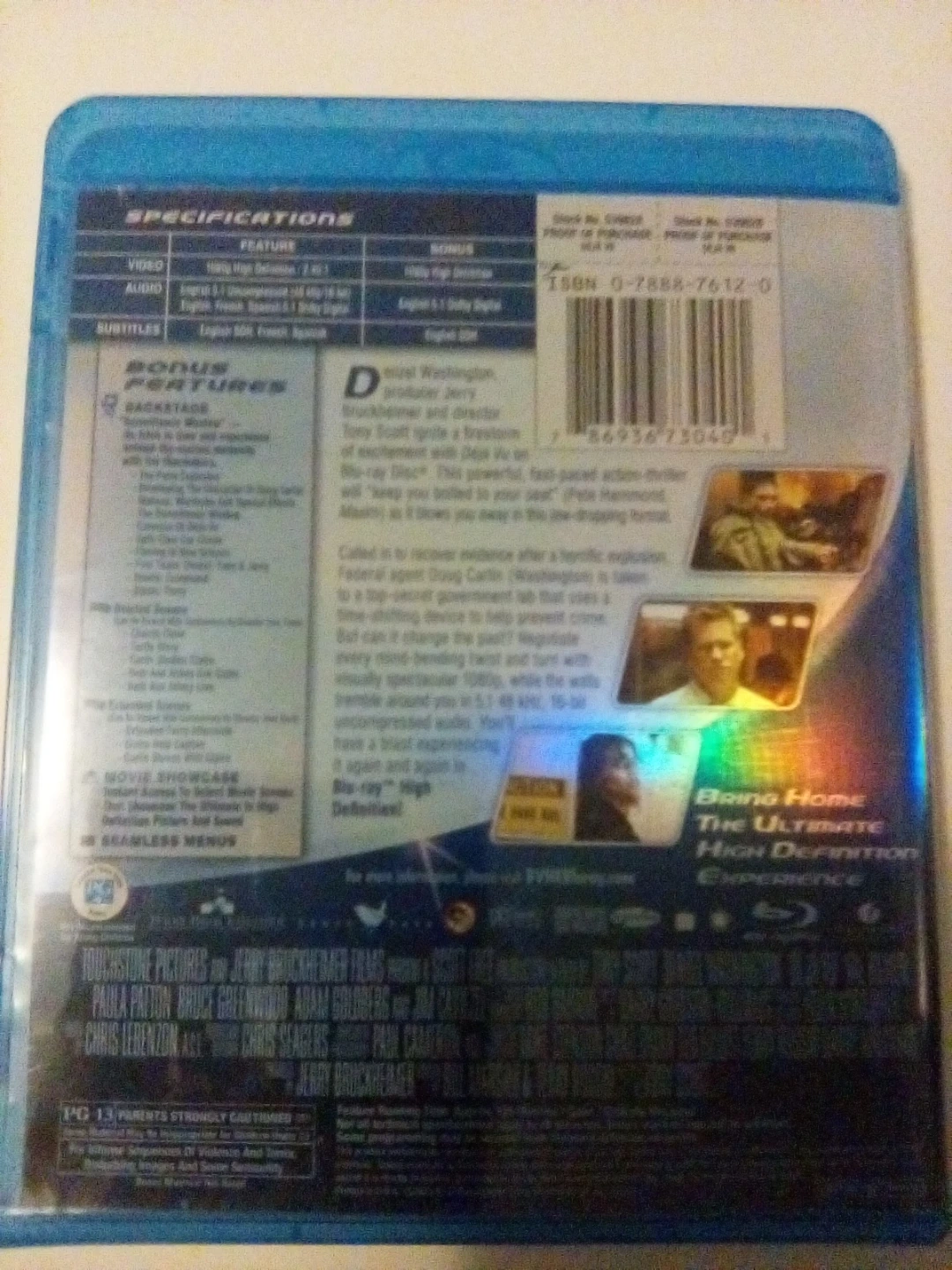 This Blu-ray disc features the action-packed thriller Déjà Vu starring Denzel Washington. It's presented in high definition with HD sound. Includes bonus features like backstage access and movie showcases.