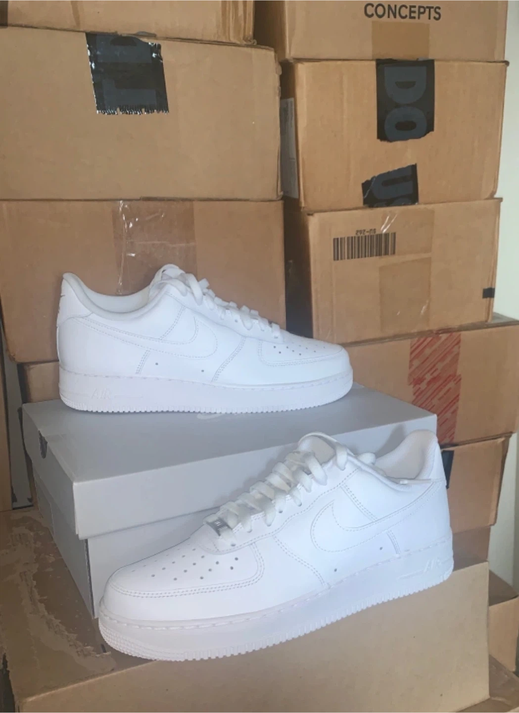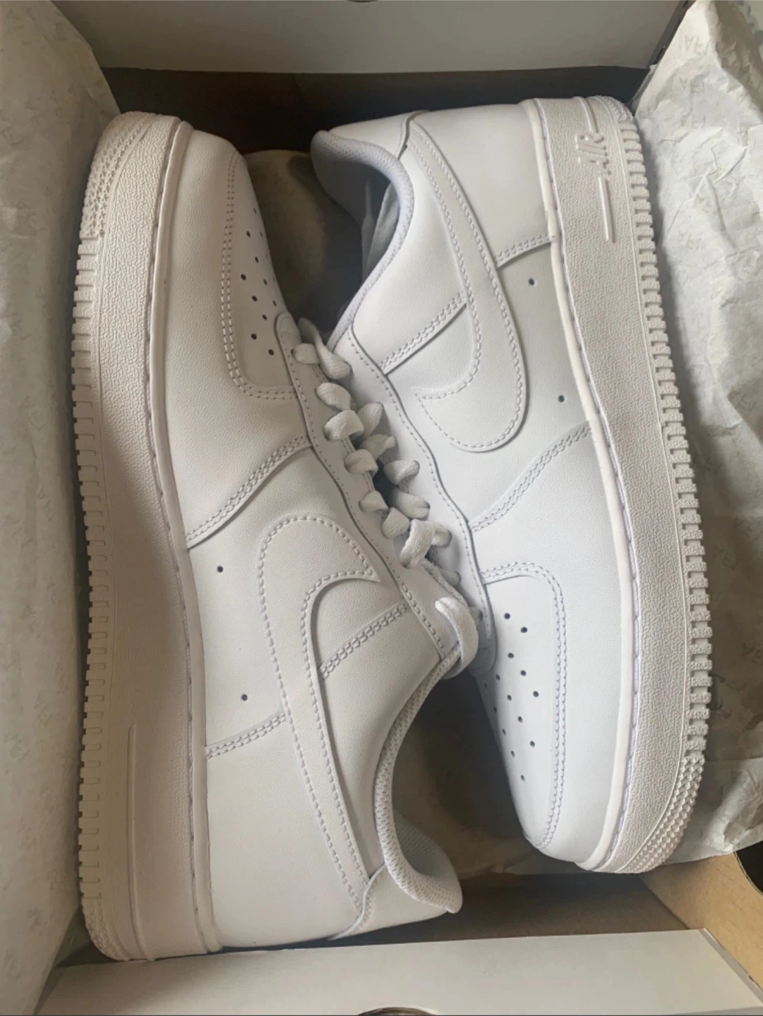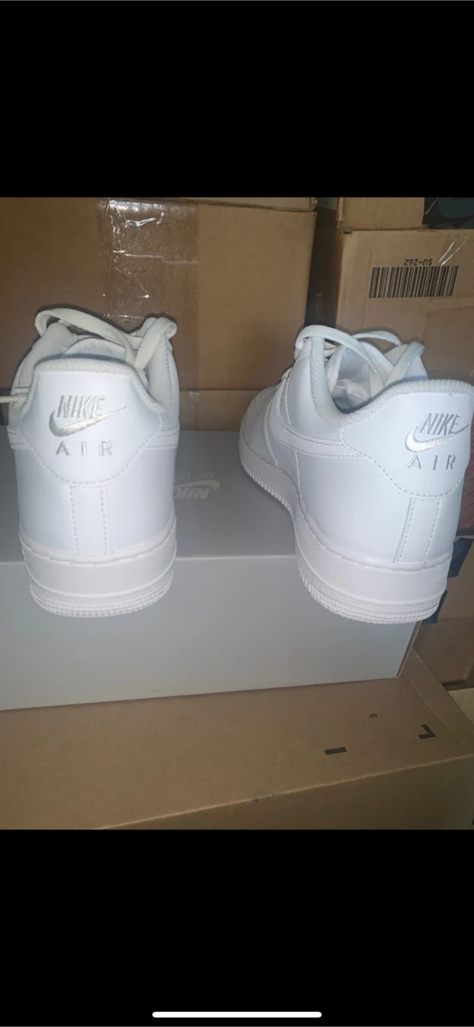Selling a pair of Nike Air Force 1 '07 in all white! They are in great condition and come with the original box. These are a men's size 10.5 US. Available in sizes 9,9.5,10,10.5,11&12