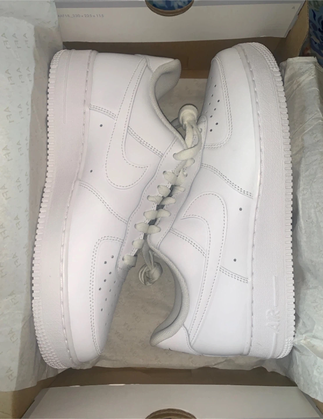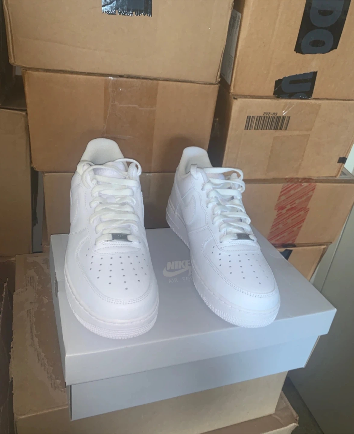 Selling a pair of Nike Air Force 1 '07 in all white! They are in great condition and come with the original box. These are a men's size 10.5 US. Available in sizes 9,9.5,10,10.5,11&12