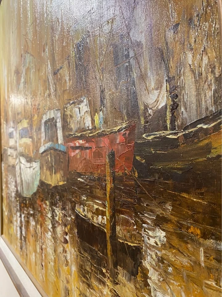 Large Vintage Oil Painting - Harbor Scene (41x41, Signed)