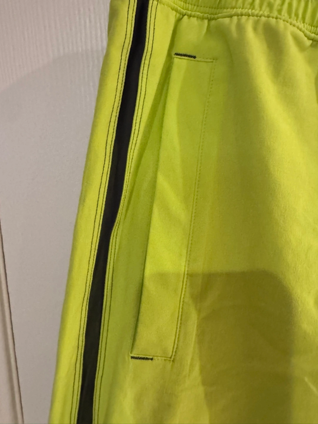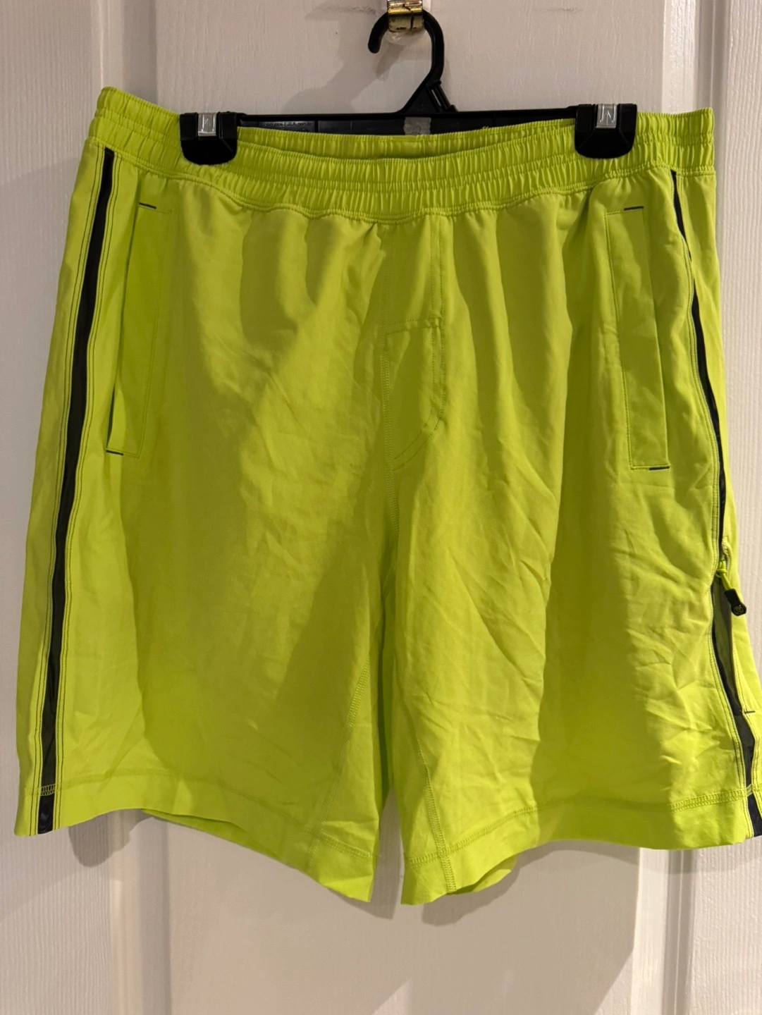 Men's athletic shorts. Bright lime green colour. Features pockets and side mesh detailing. Elastic waistband. Great for running or working out.