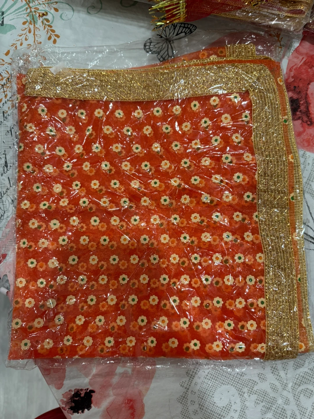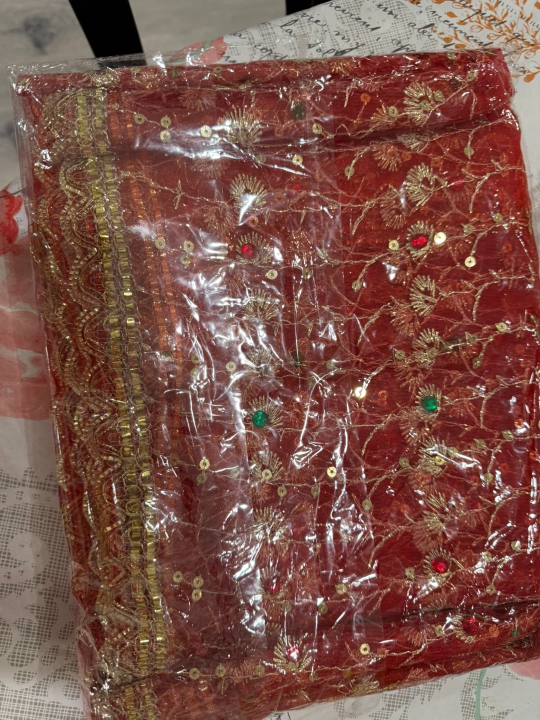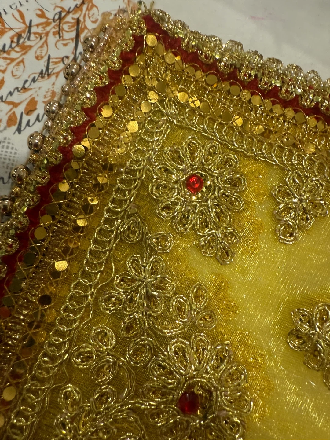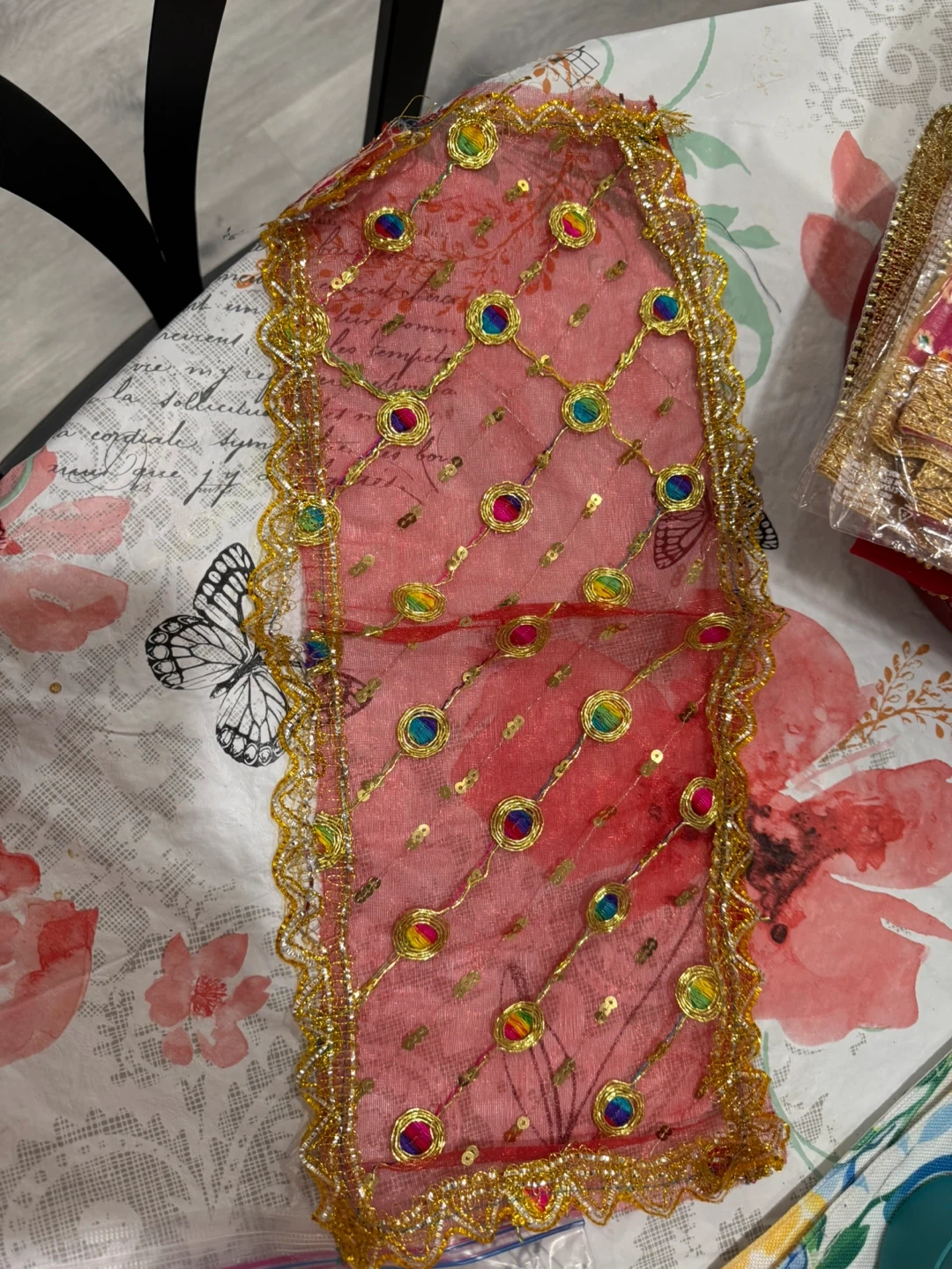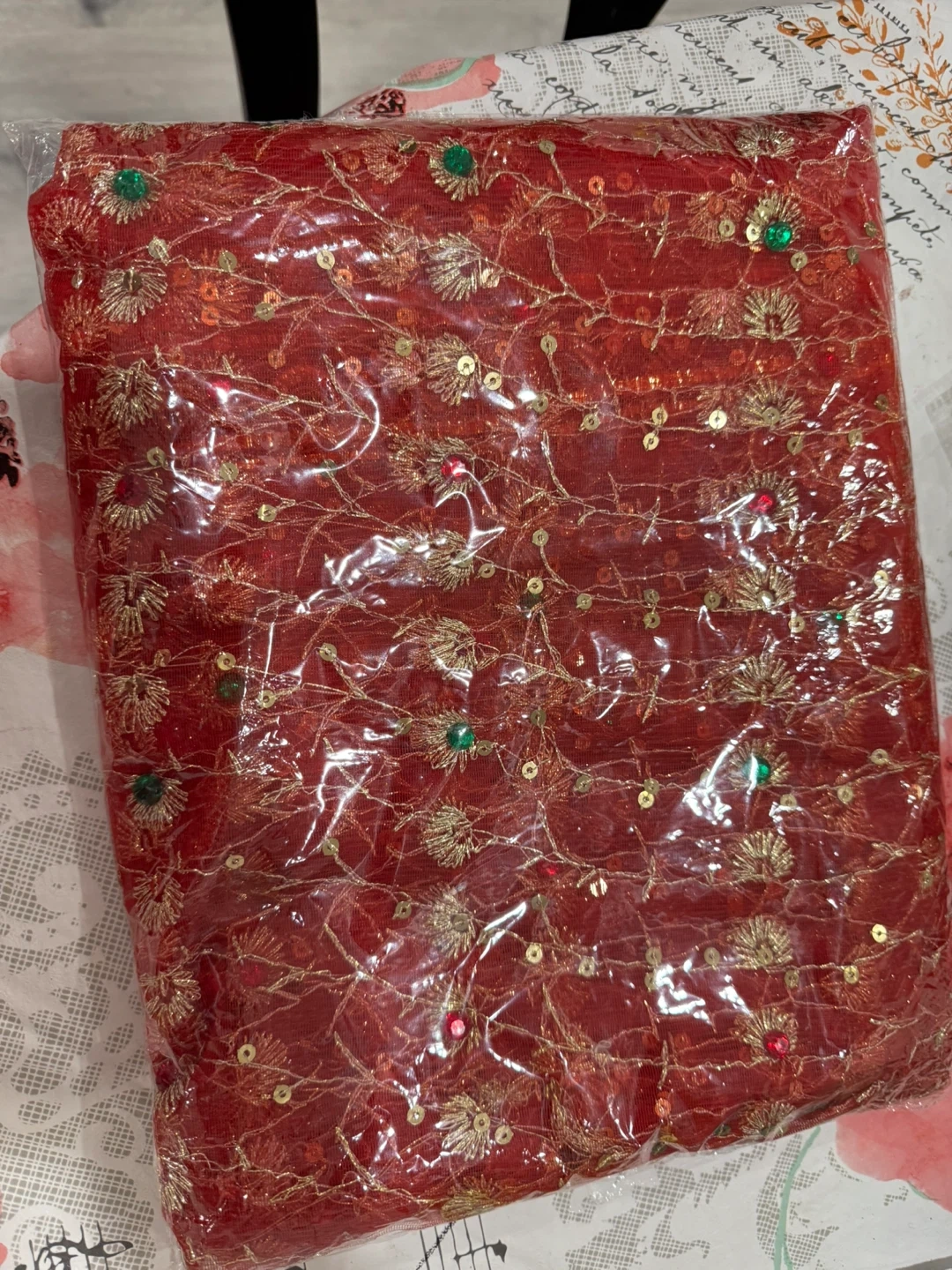This lot includes three embellished fabric pieces. Designs feature gold thread embroidery, sequins, and colourful beads. These fabrics are ideal for crafting projects or as decorative accents.
