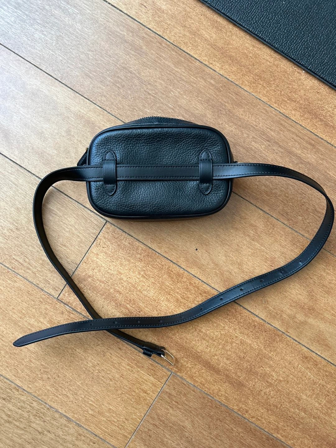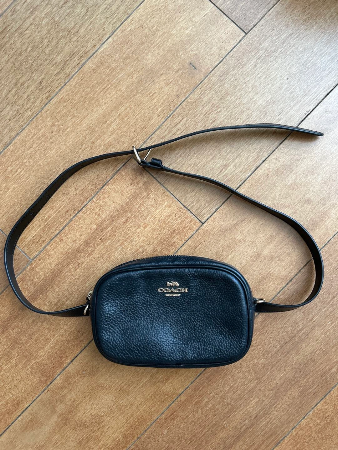 Like new black leather belt and purse attachment (fannypack) from Coach. Belt removable and can be worn on its own or bag used as a clutch.