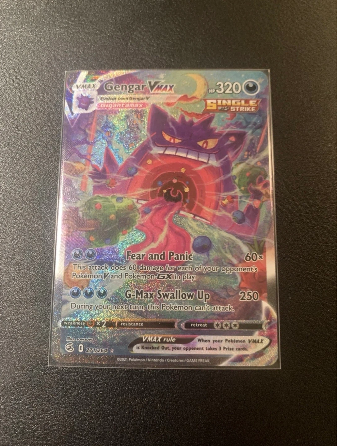 This is the Gengar VMAX card from Pokémon, with HP 320. It features the Gigantamax form and the Single Strike style. The card number is 271/264.