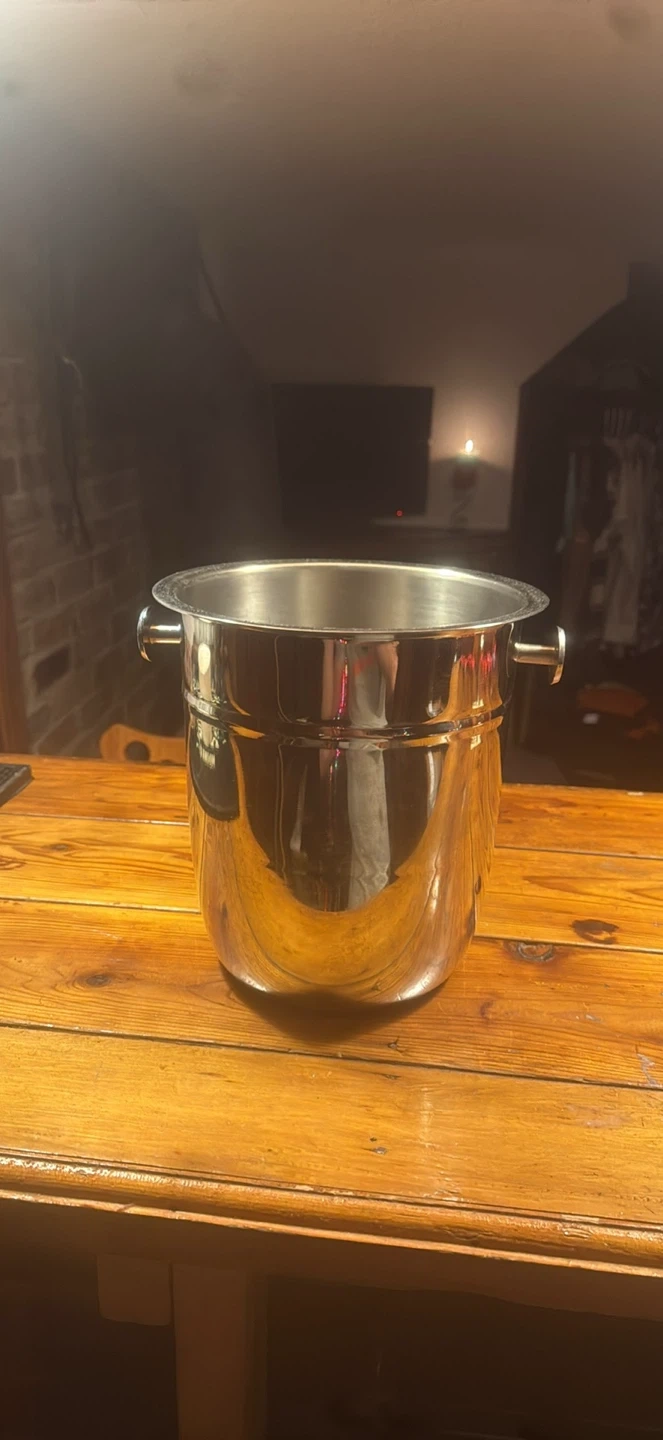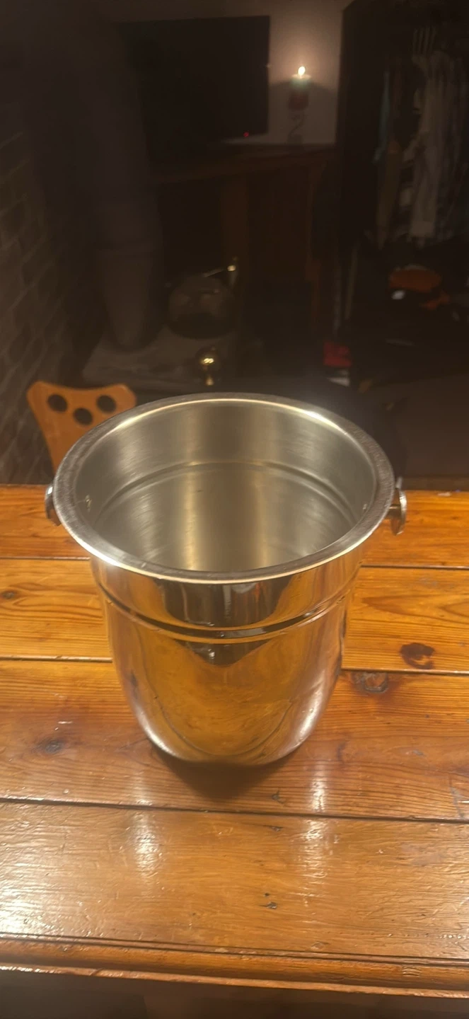 A classic stainless steel ice bucket with two side handles. It's great for keeping drinks chilled at parties or gatherings. This bucket is made of durable stainless steel.