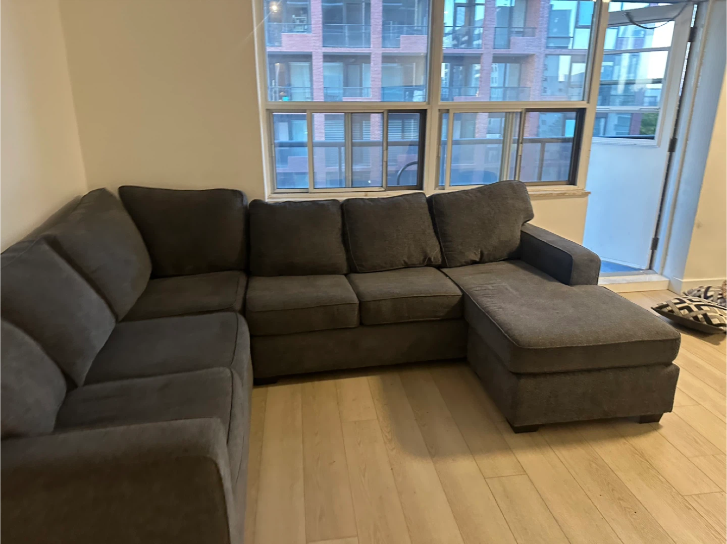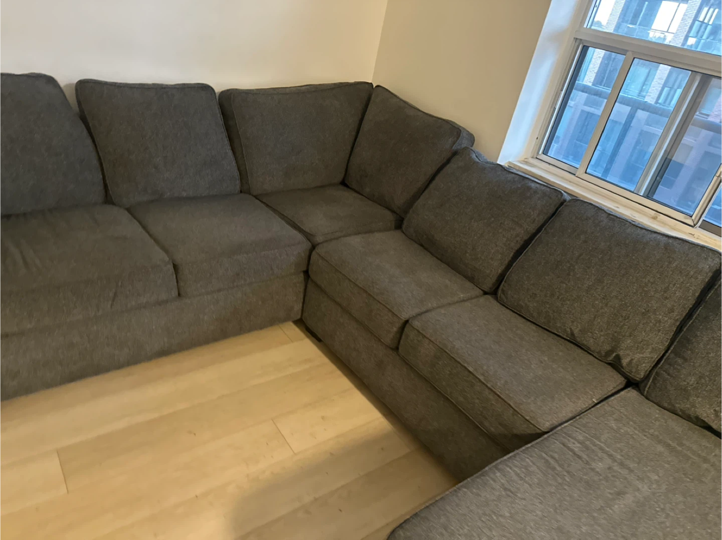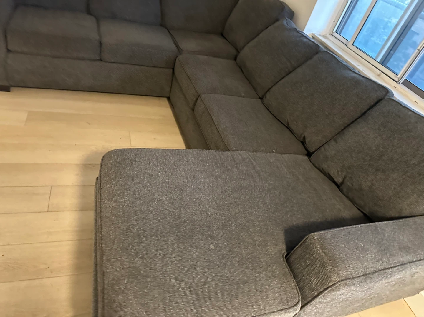 Selling a comfortable grey sectional sofa. It's in great shape and ready for a new home! Perfect for lounging and movie nights, this sofa will bring a cozy vibe to your living space