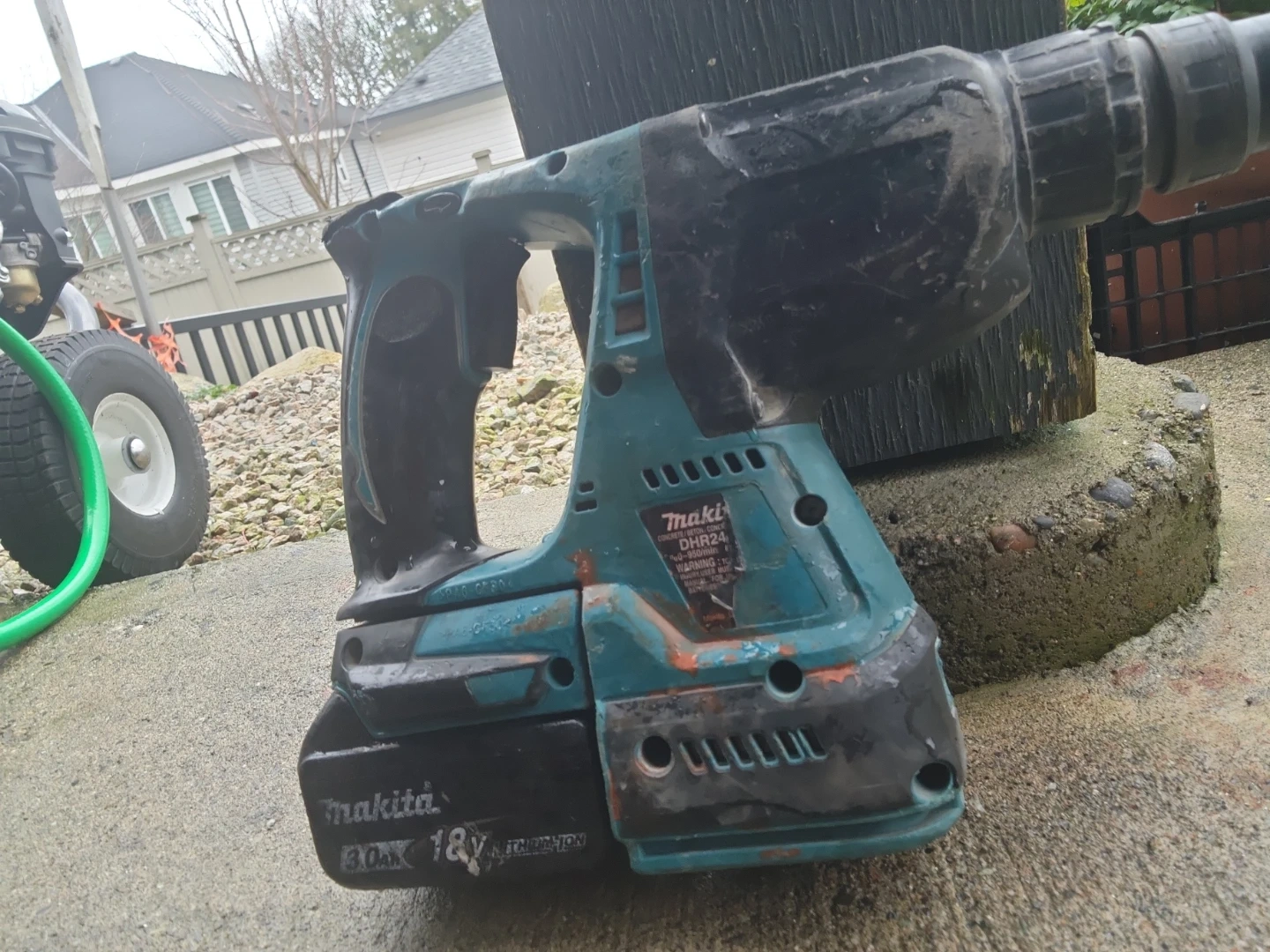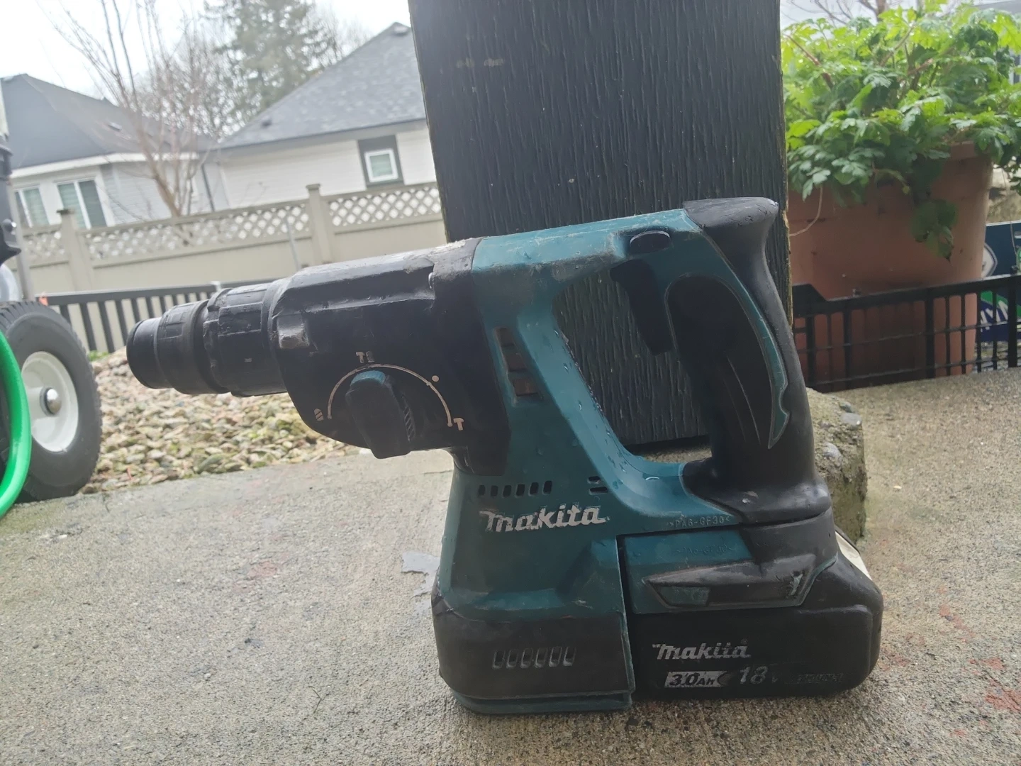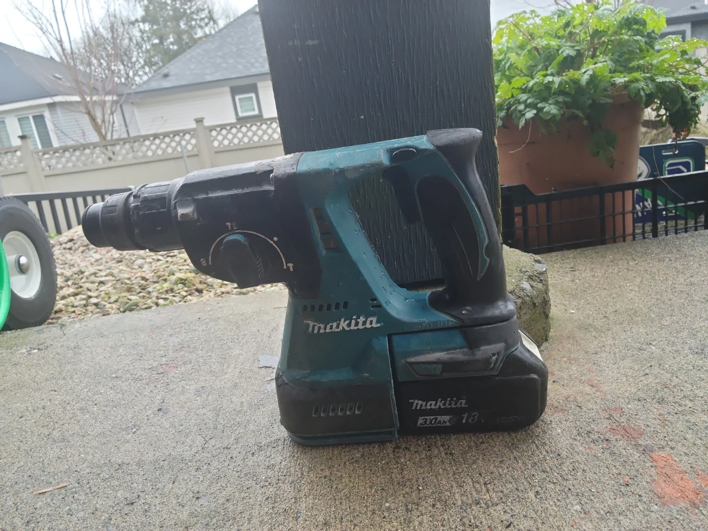 This is a Makita DHR24 hammer drill with an 18V battery. It has a 3.0Ah battery. It's a cordless tool for drilling and hammering tasks.