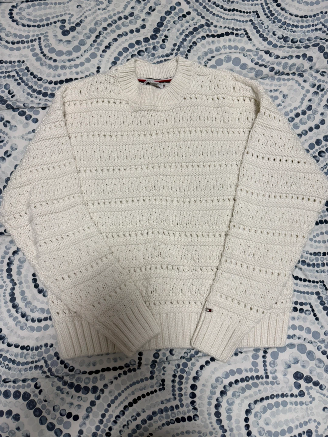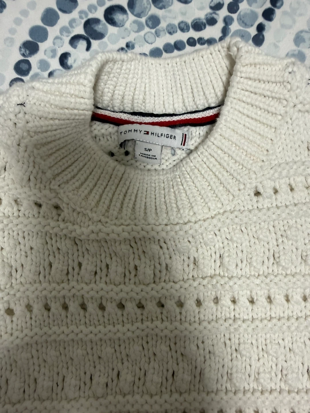 This is a white Tommy Hilfiger knit sweater. It's a size S/P. The knit has a textured, open-weave pattern.