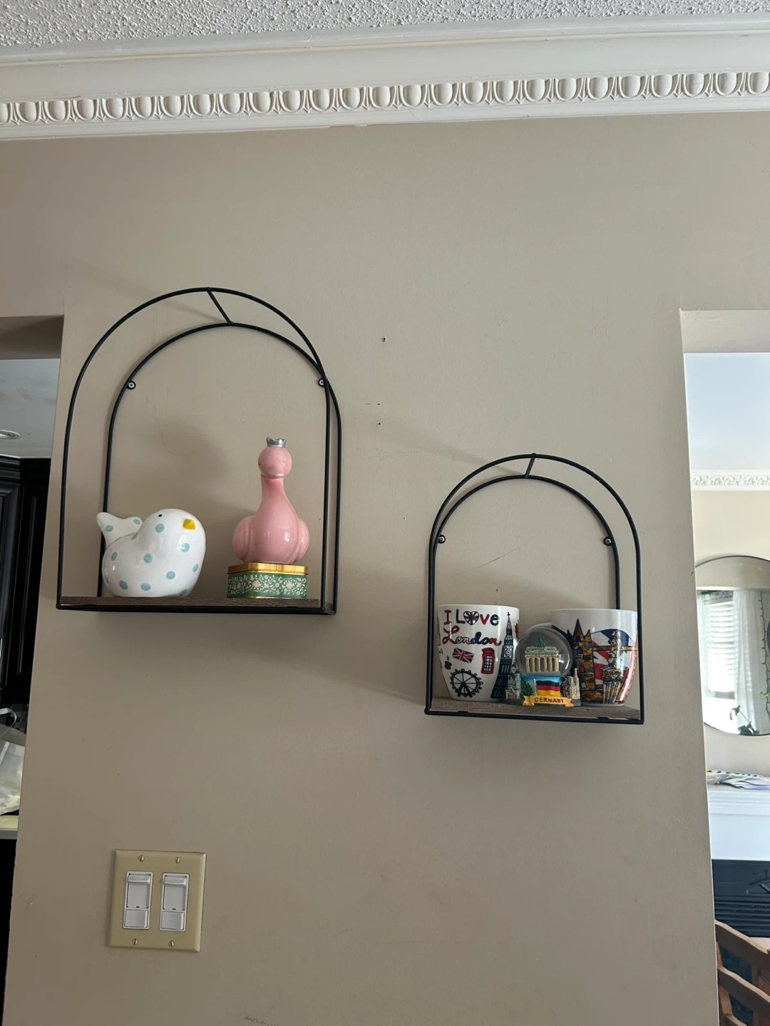 Set of two black metal arched wall shelves. Includes a ceramic bird, a pink decorative object, two "I Love London" mugs, and a "Germany" snow globe. These shelves add a unique touch to any room!