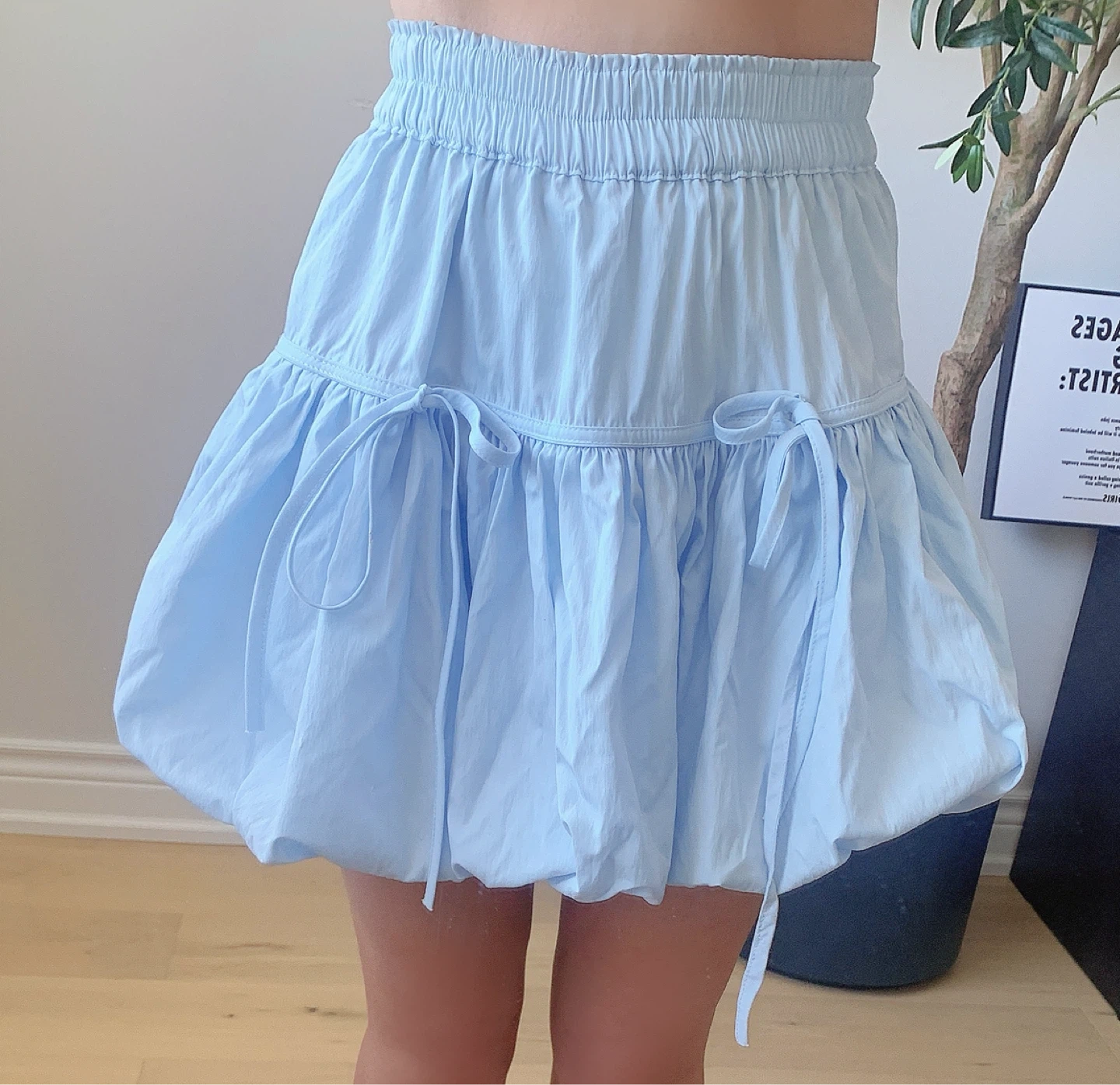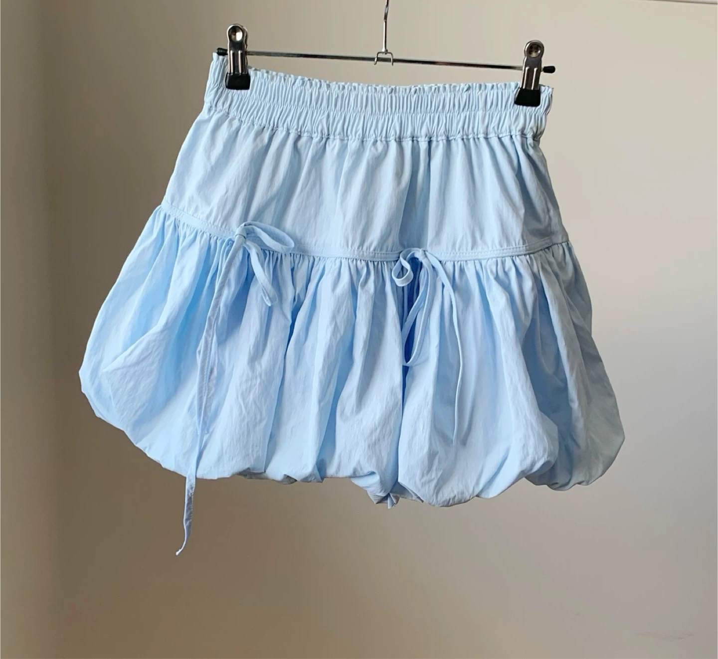 Light baby blue mini skirt with a cute puff / bubble shape and ballet-inspired design.