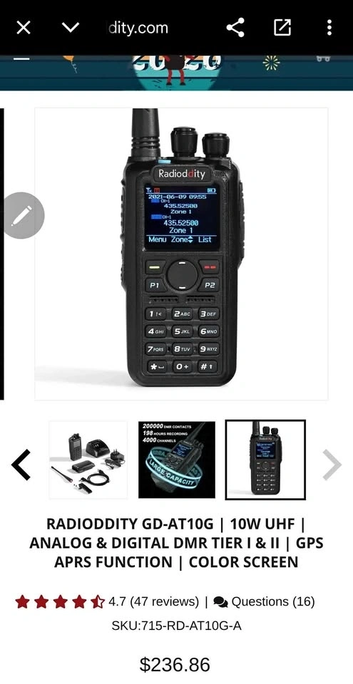 This is a powerful handheld radio with selectable output power of 10W/5W/2.5W/1W and room for up to 200,000 DMR contacts. It's a dual-mode UHF radio, allowing you to switch between analog and digital (DMR Tier I & Tier II) operation. Features built-in GPS for APRS, useful for outdoor and overland communities. The Talker Alias function displays your name or callsign on receiving radios. It has a large 3100mAh battery for up to 14 hours of continuous use and crystal-clear audio. Asking $120 or best offer.