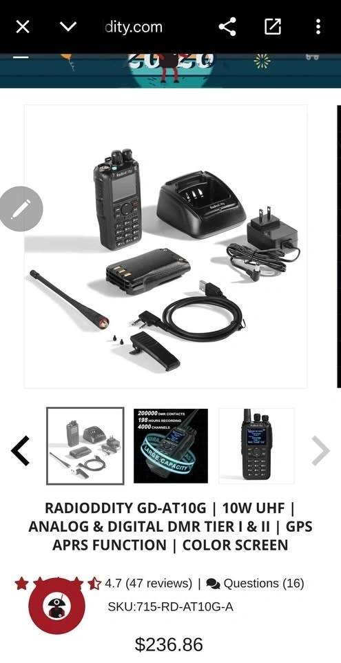 This is a powerful handheld radio with selectable output power of 10W/5W/2.5W/1W and room for up to 200,000 DMR contacts. It's a dual-mode UHF radio, allowing you to switch between analog and digital (DMR Tier I & Tier II) operation. Features built-in GPS for APRS, useful for outdoor and overland communities. The Talker Alias function displays your name or callsign on receiving radios. It has a large 3100mAh battery for up to 14 hours of continuous use and crystal-clear audio. Asking $120 or best offer.