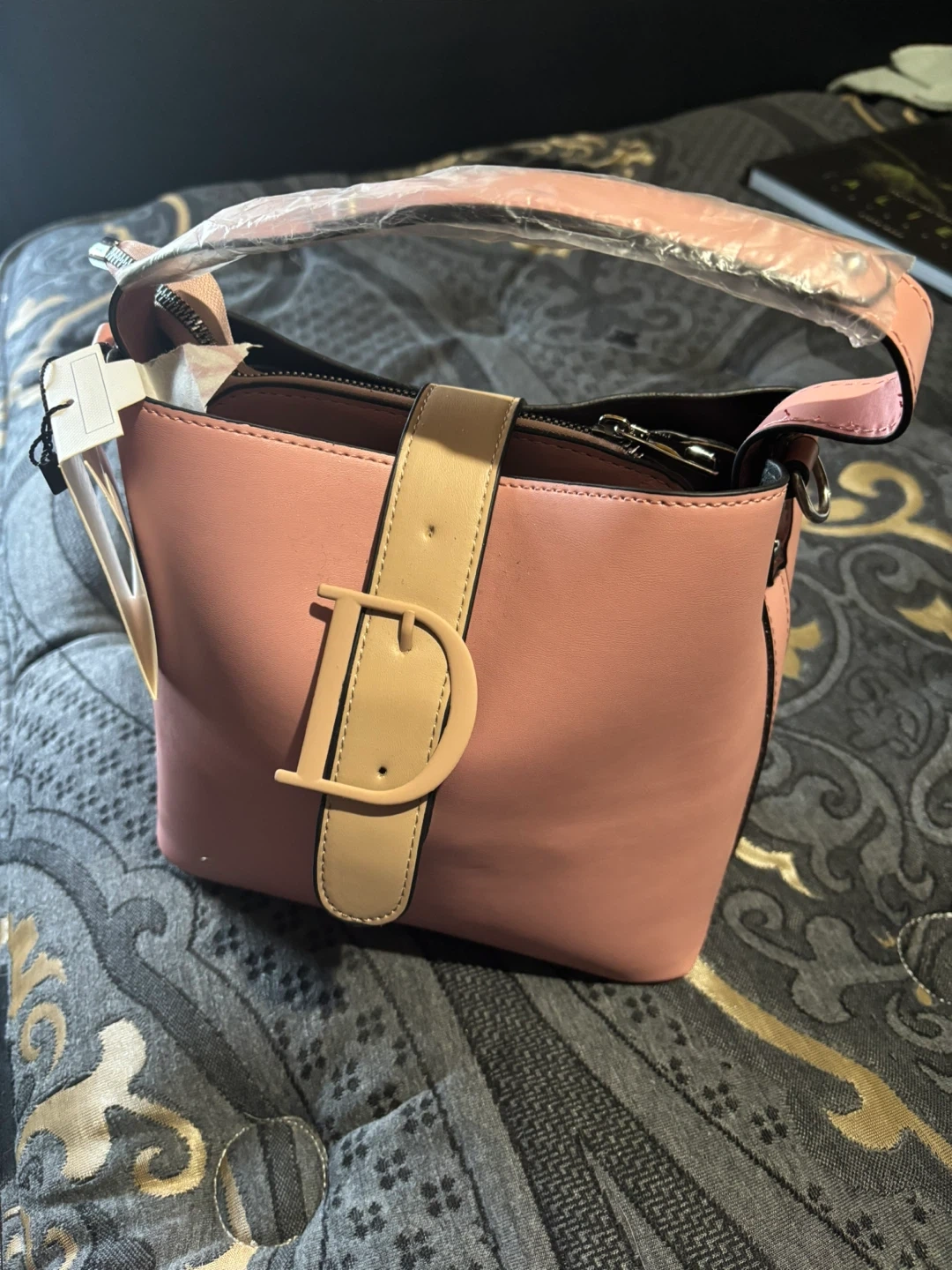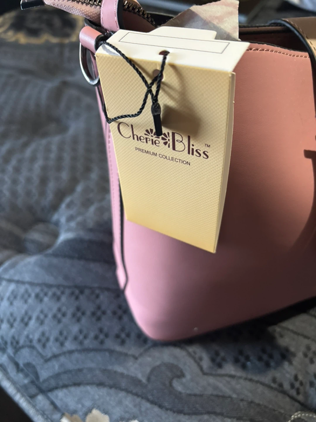 This is a lovely pink handbag from Cherie Bliss's Premium Collection. It's designed with a secure zip closure and a decorative buckle detail. The material appears to be faux leather. It's a great size for everyday essentials!