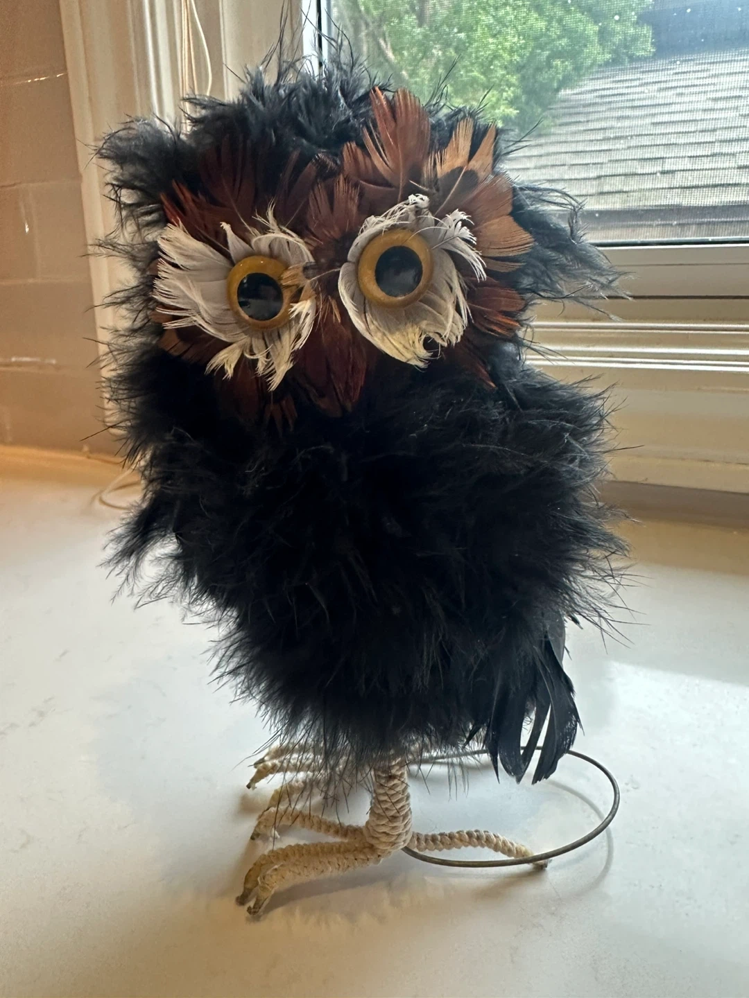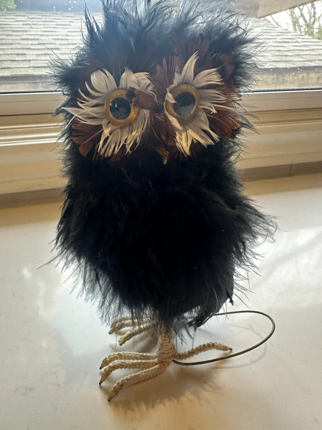 Here's a cute pair of owl figurines! They're covered in black, brown, and white feathers with wire feet. These little guys would add a fun touch to any shelf or display.