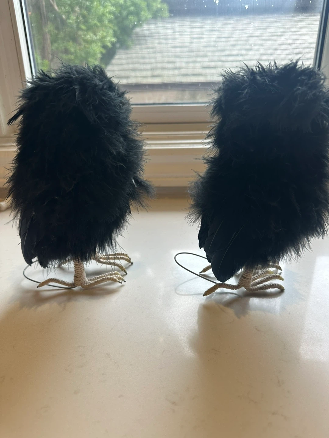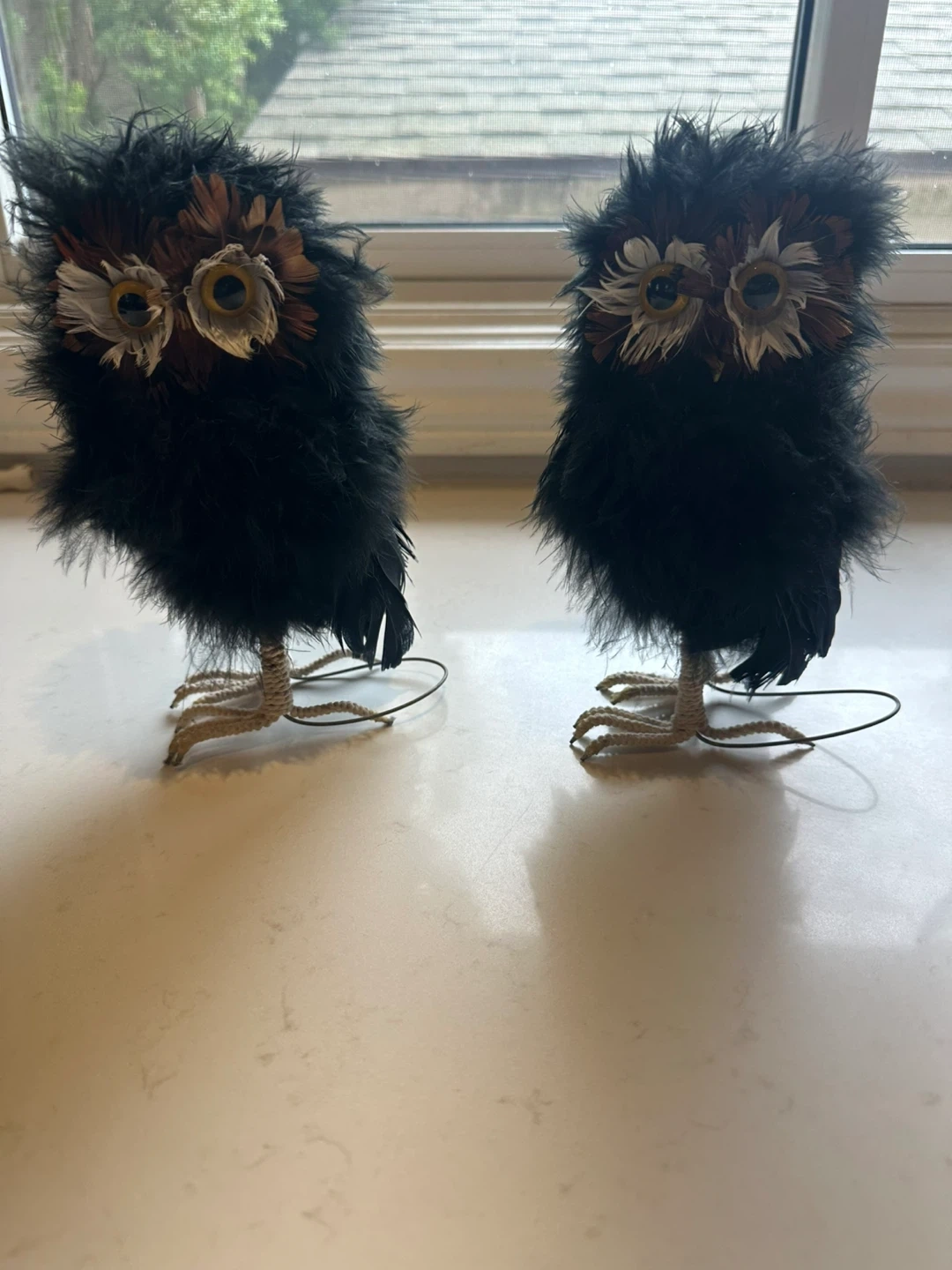 Here's a cute pair of owl figurines! They're covered in black, brown, and white feathers with wire feet. These little guys would add a fun touch to any shelf or display.