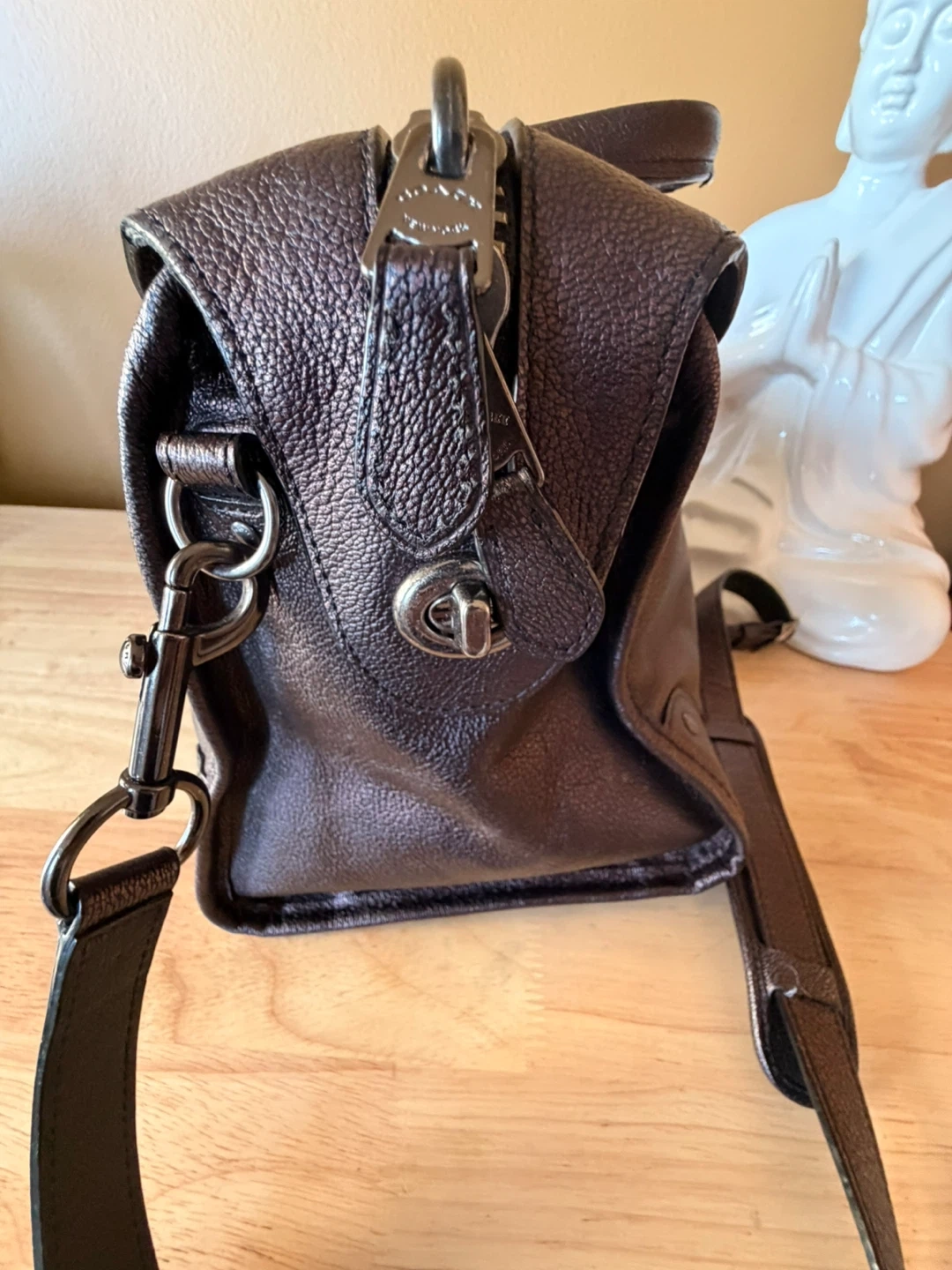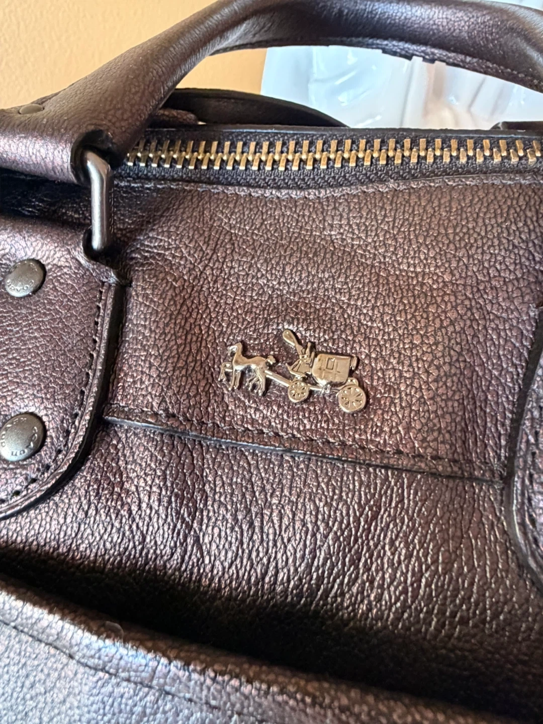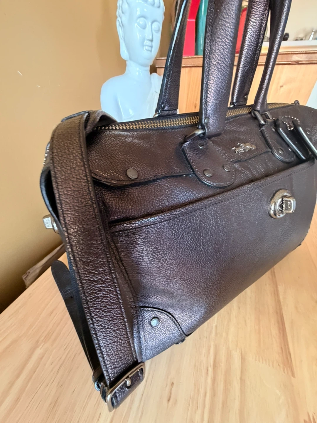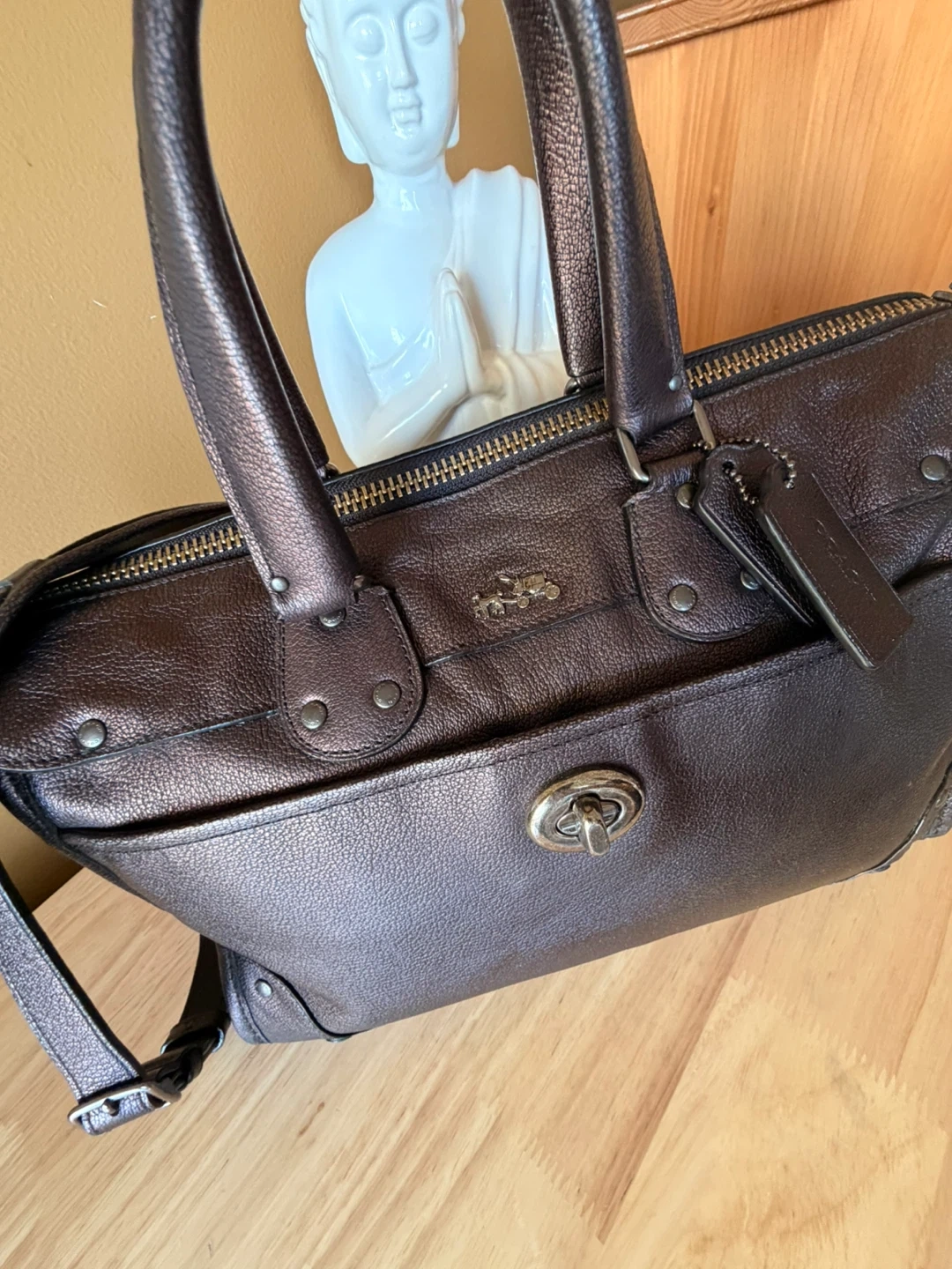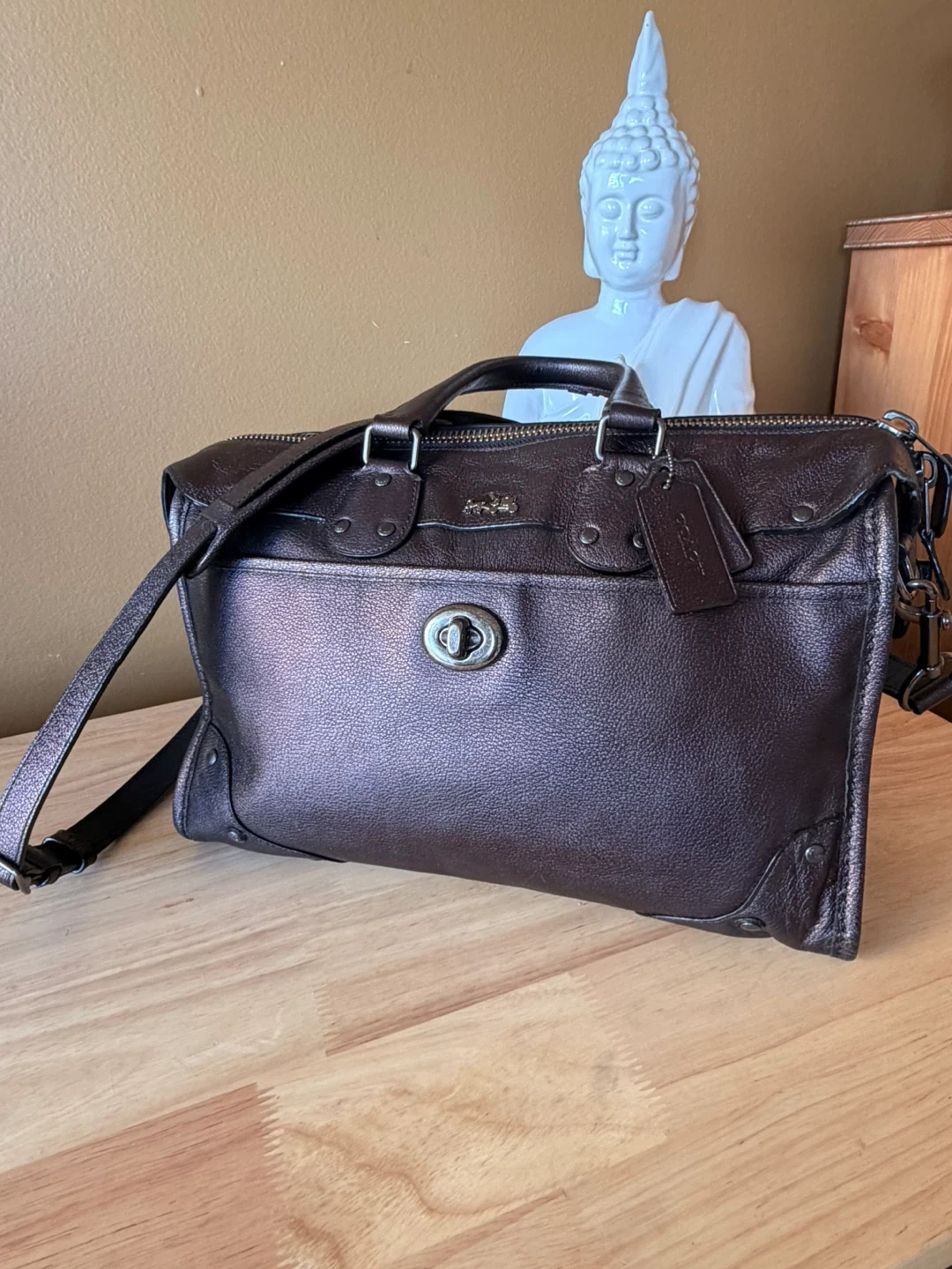 A stylish Coach satchel bag in a metallic bronze leather. It features a turn-lock closure and a detachable shoulder strap. This bag is made of genuine leather.