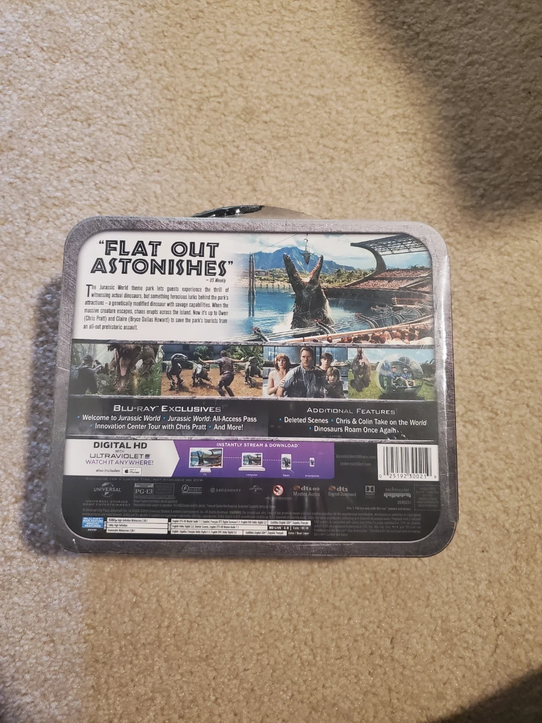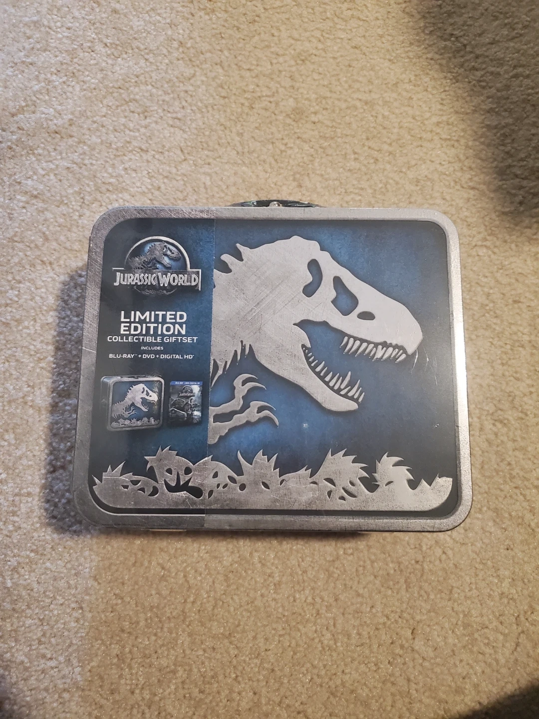 This Jurassic World limited edition collectible giftset Blu-ray, DVD. It comes in a metal tin/lunch box, still wrapped. Brand new never opened