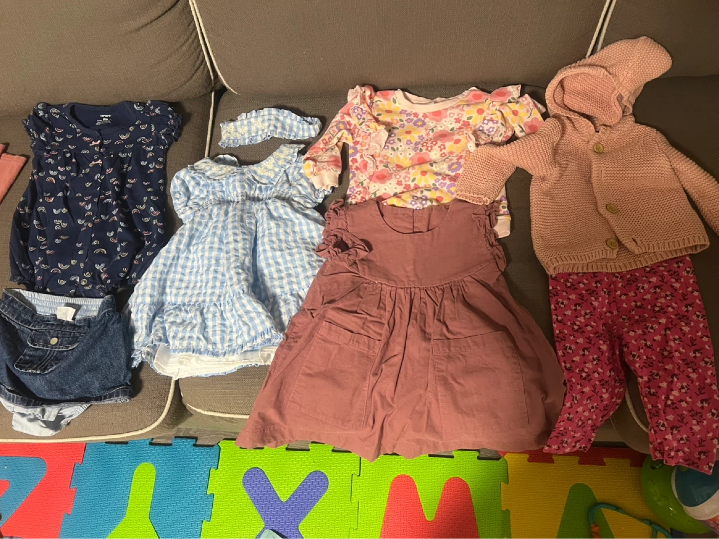 A variety of cute and gently used baby girl outfits and separates for 6mos onwards Includes dresses, pants, tops, and outerwear. All for $90.