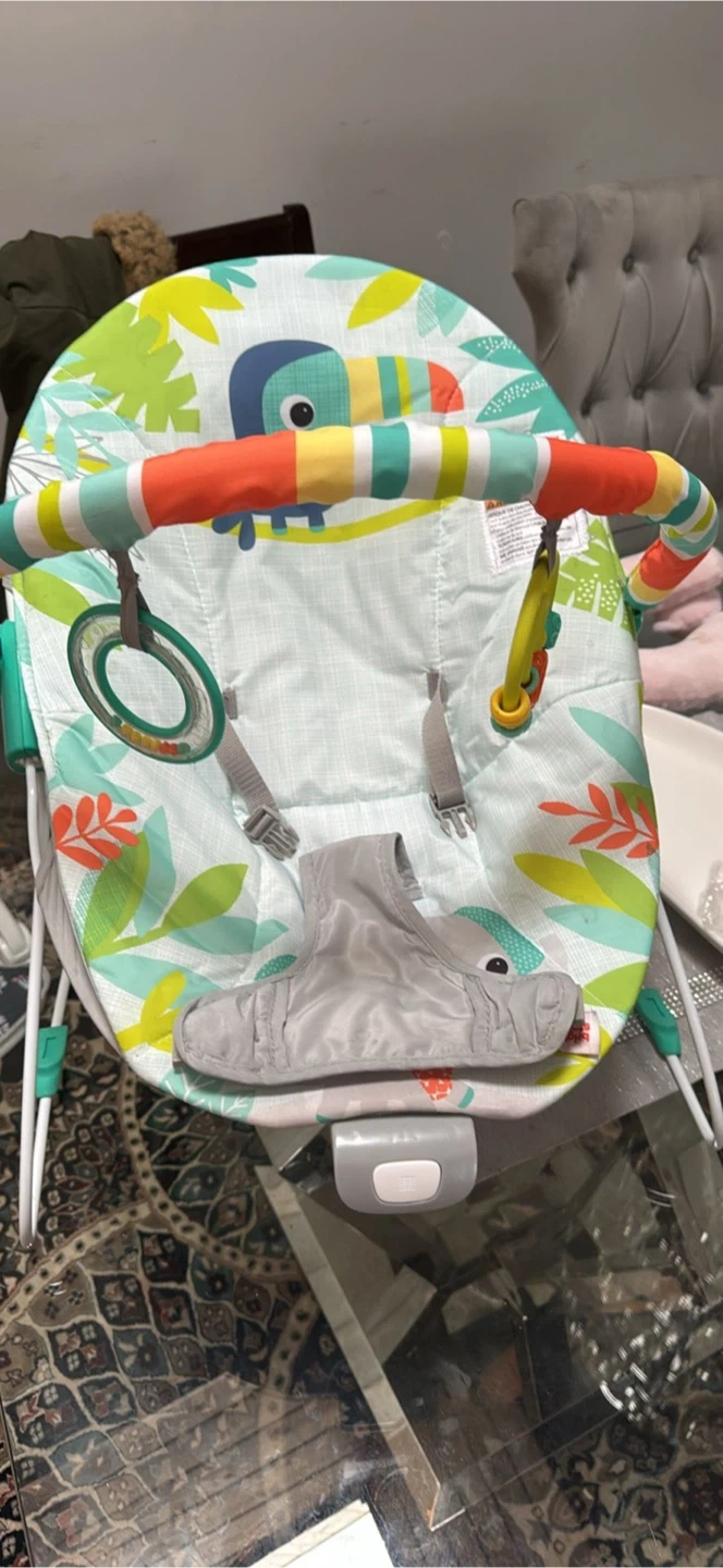 This is a Bright Starts baby bouncer seat. It's designed with a fun jungle theme, featuring toucans and tropical leaves. It includes a removable toy bar with a ring for baby to grasp.