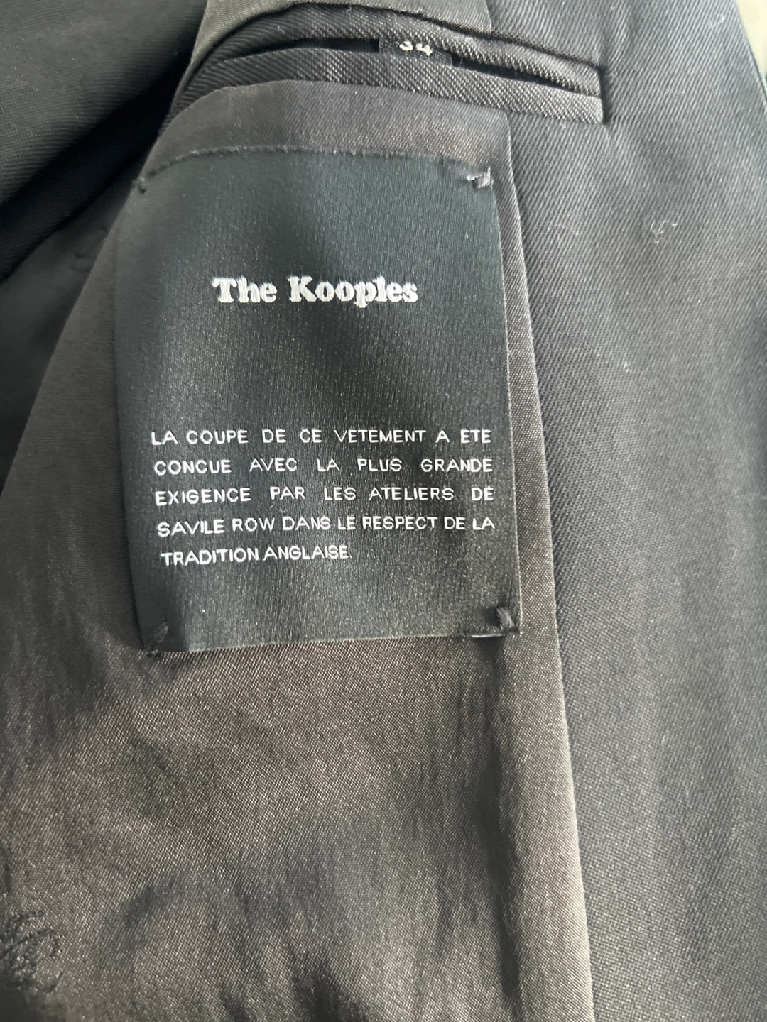 Selling a stylish black suit from The Kooples in size 34. It's in great condition and ready for a new owner! The suit features a unique design.