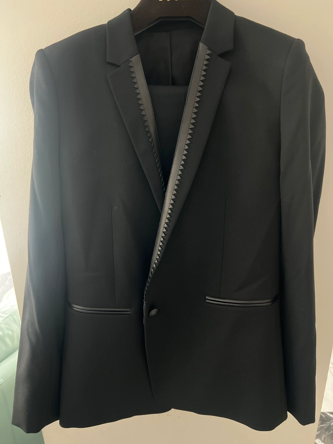 Selling a stylish black suit from The Kooples in size 34. It's in great condition and ready for a new owner! The suit features a unique design.