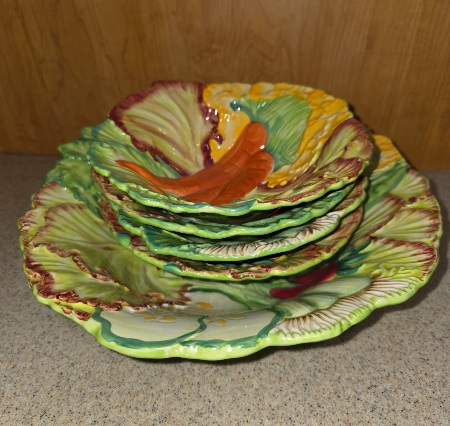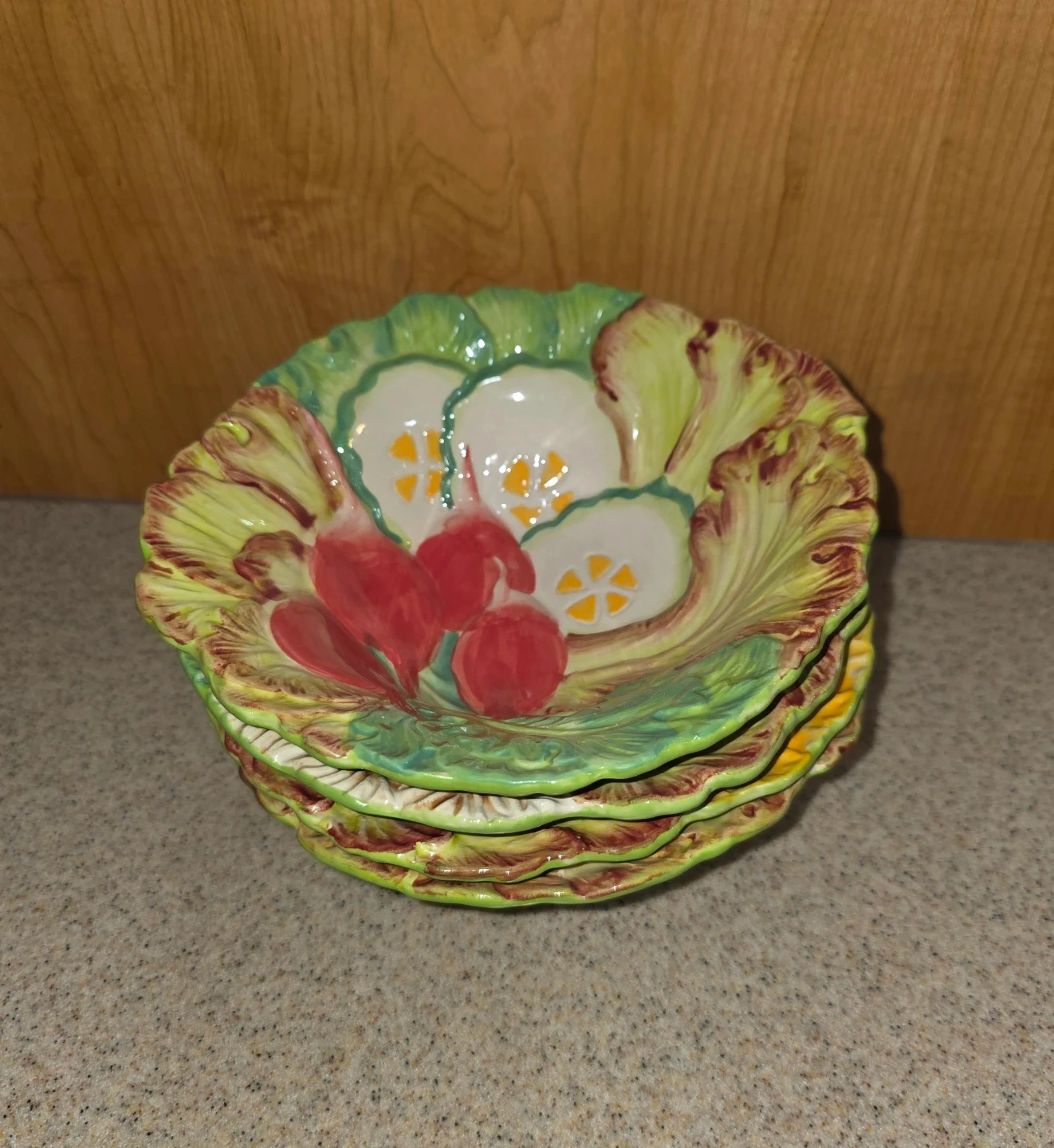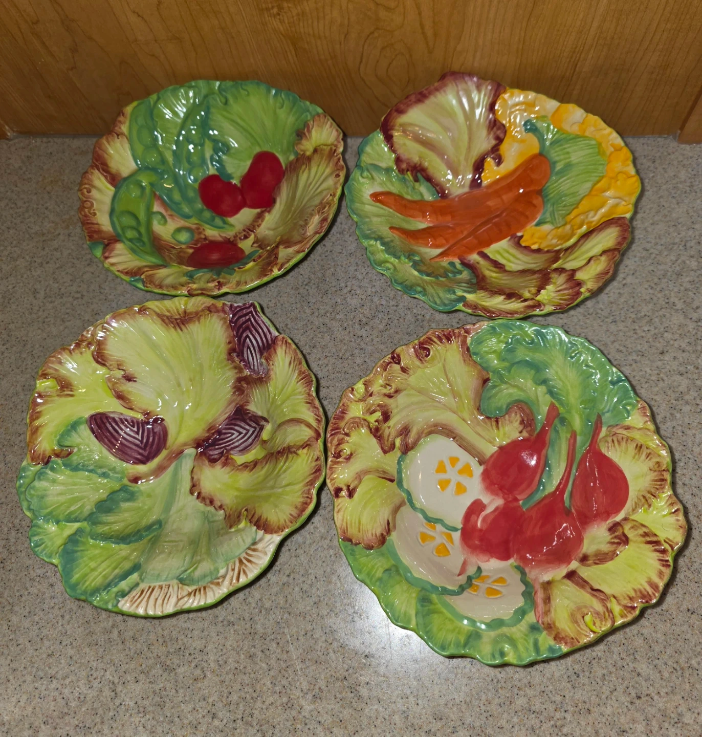 A 5 piece set by the brand Temptations Presentable Ovenware Figural Vegetable Bowl set. It's oven, dishwasher, and microwave safe. The bowls are decorated with figural vegetables. They're in great condition! The large bowl measures around 12 inches in diameter, and the individual bowls are approximately 8 inches in diameter.