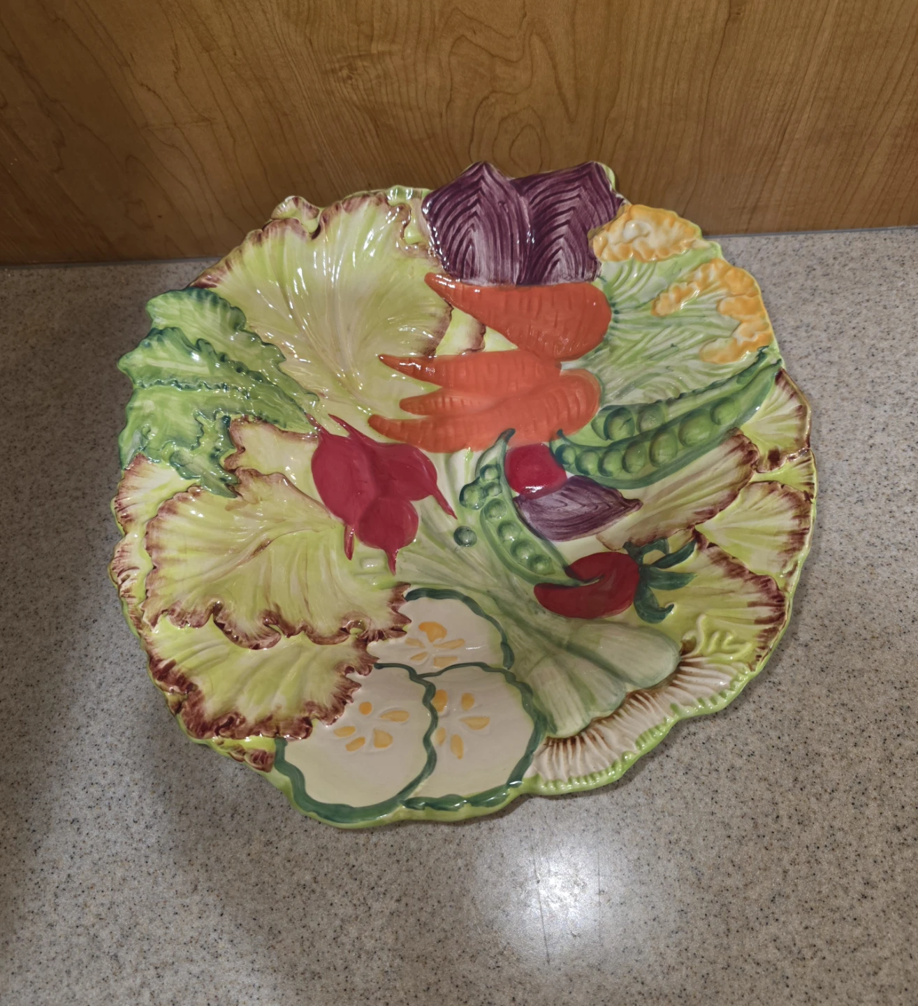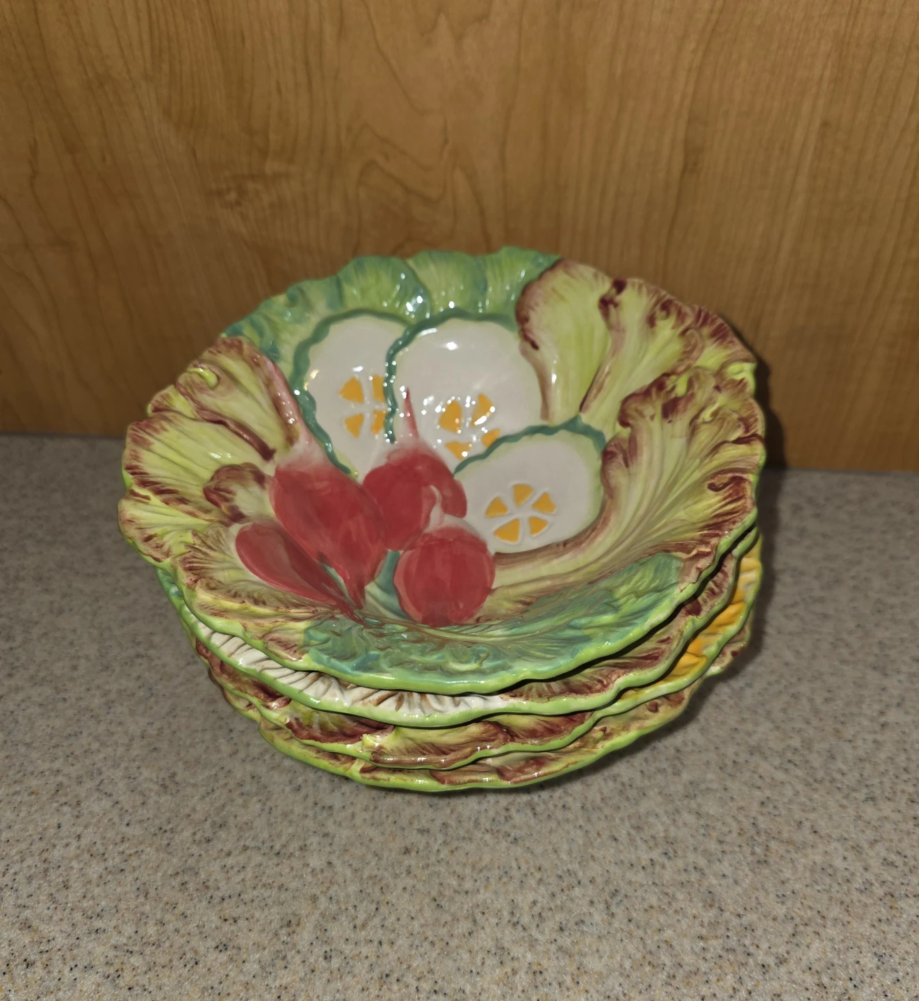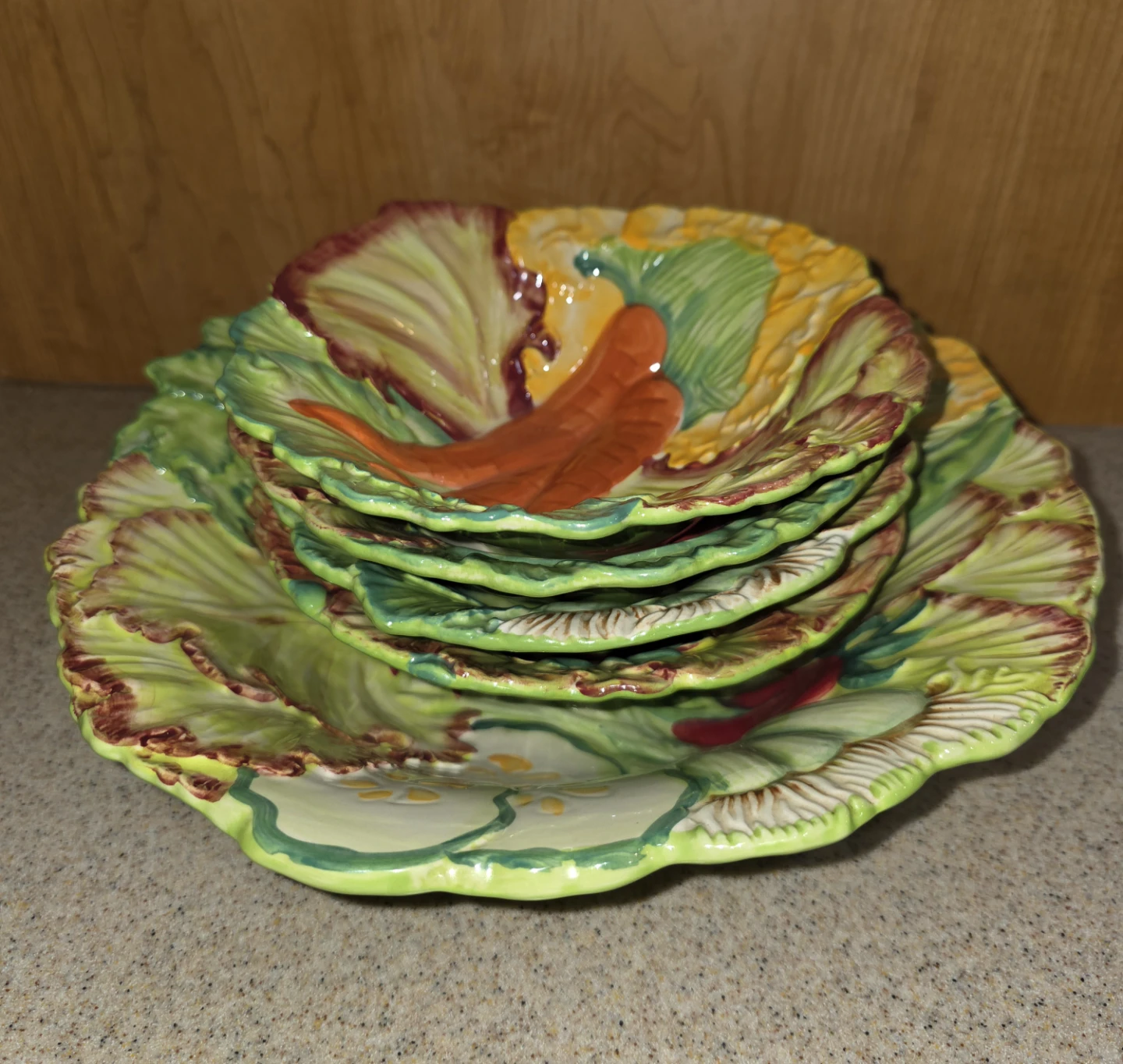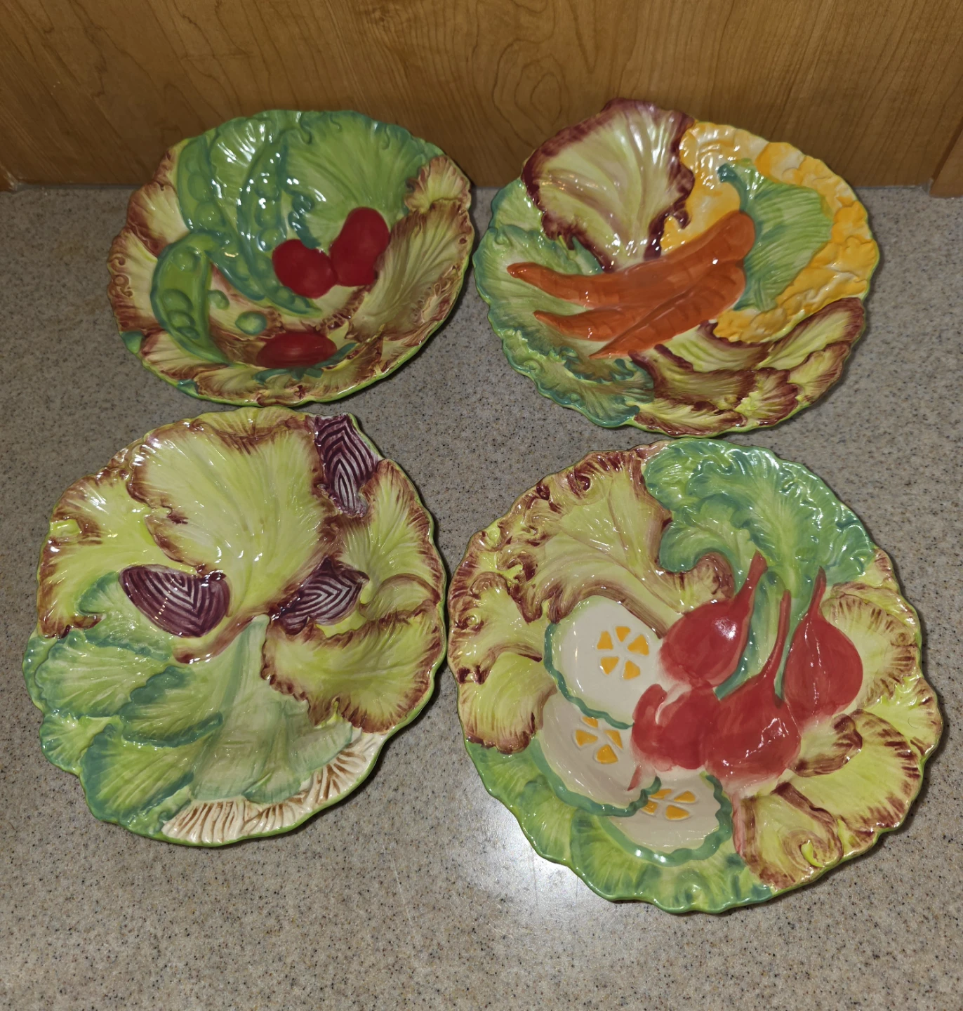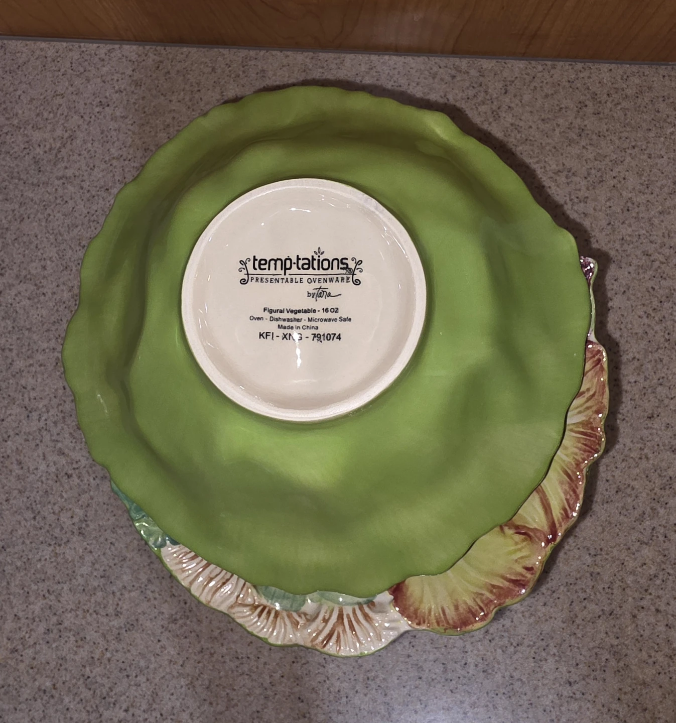 A 5 piece set by the brand Temptations Presentable Ovenware Figural Vegetable Bowl set. It's oven, dishwasher, and microwave safe. The bowls are decorated with figural vegetables. They're in great condition! The large bowl measures around 12 inches in diameter, and the individual bowls are approximately 8 inches in diameter.