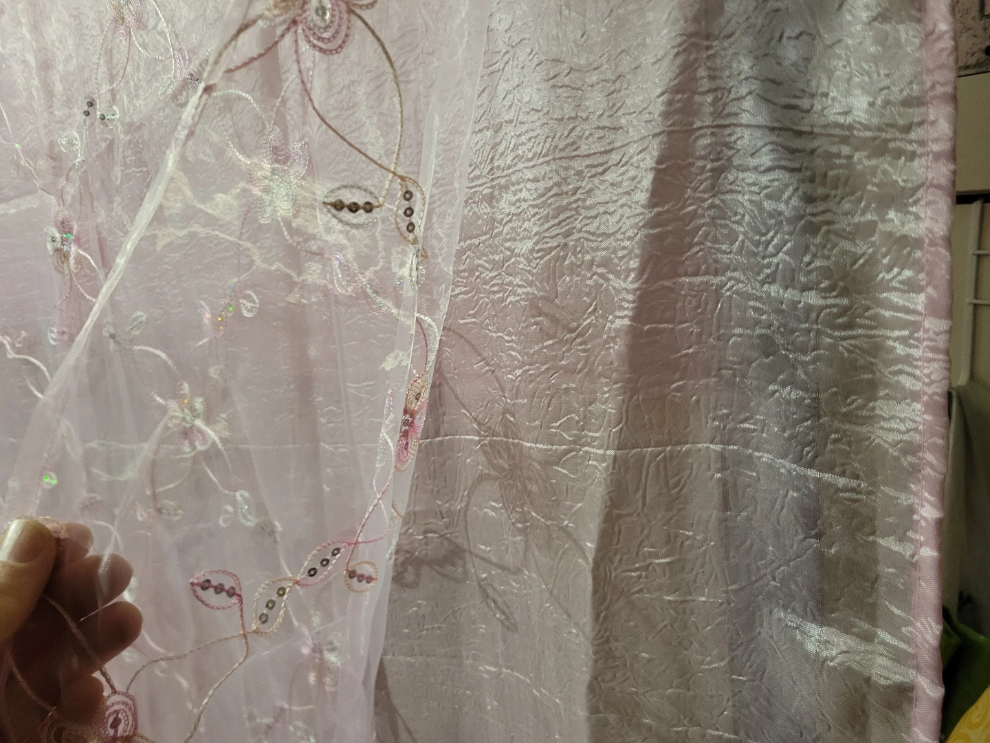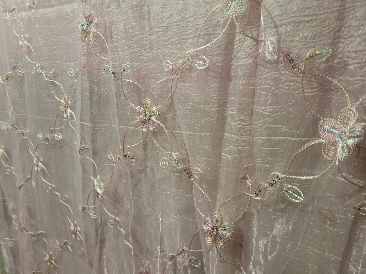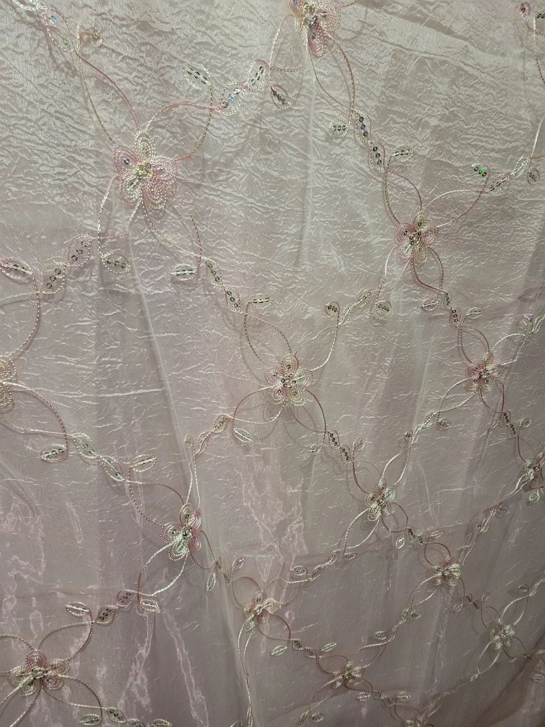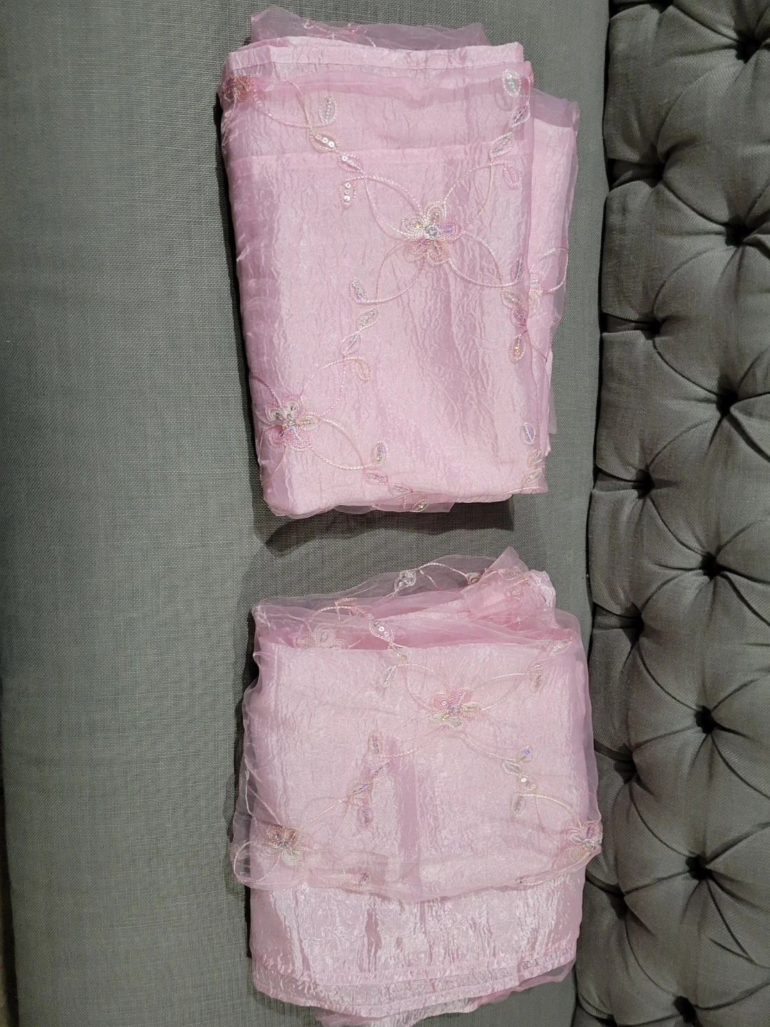 Two sheer pink curtains with delicate floral embroidery and sequin accents. Each curtain measures 51 inches by 86 inches. Adds a touch of sparkle and elegance to any room! $20 Each. Let me know if you are interested. Thanks