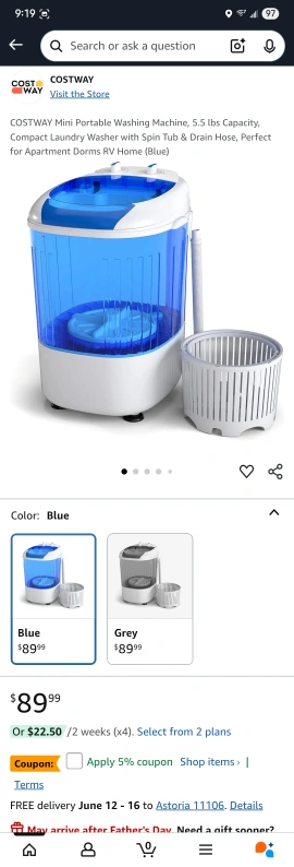 This washer and spinner combo, with a separate spin basket, makes laundry tasks fast and efficient. The portable washing machine can handle up to 5.5 lbs/2.5 kg of laundry per load, perfect for T-shirts, pants, towels, socks and underwear.