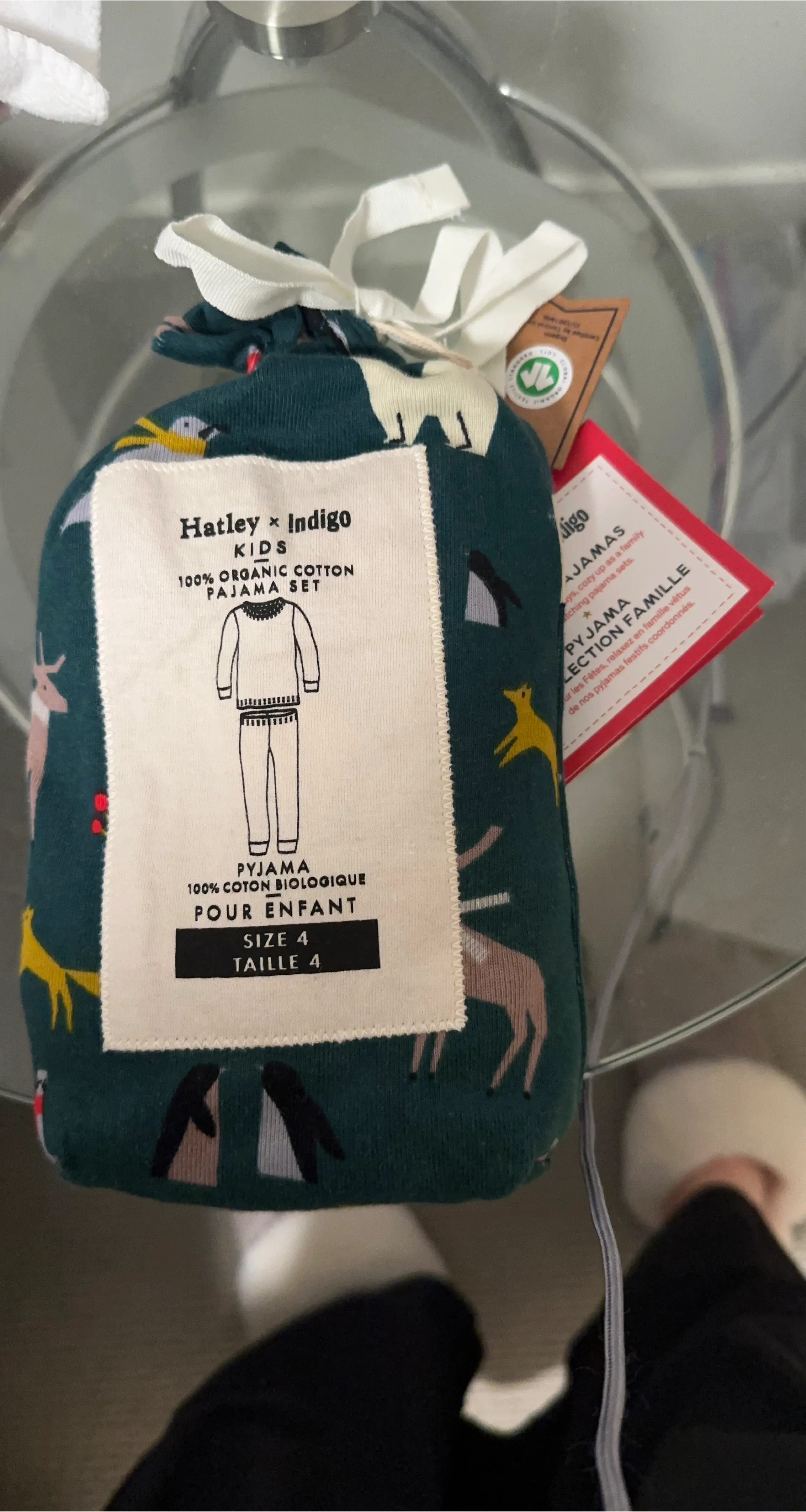 Brand new Hatley x Indigo Kids 100% organic cotton pajama set in size 4! The pajama is a fun print featuring reindeers, polar bears, foxes, penguins and snow flakes on a dark green background. Perfect for your little one!