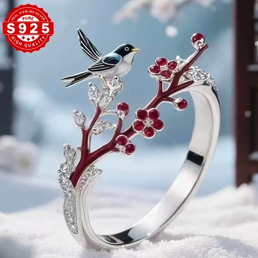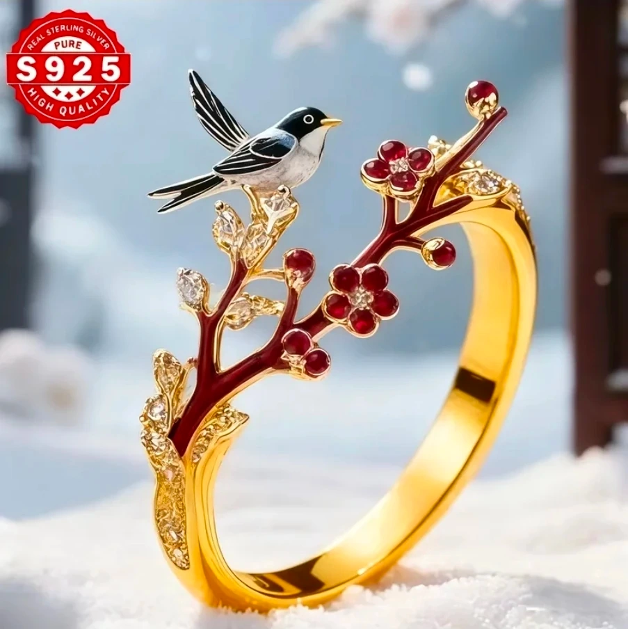Beautiful S925 sterling silver bangle featuring a bird and flower design. It has a high quality finish. Maggie bird with cherry blossoms in silver plated and gold plated, adjustable size.