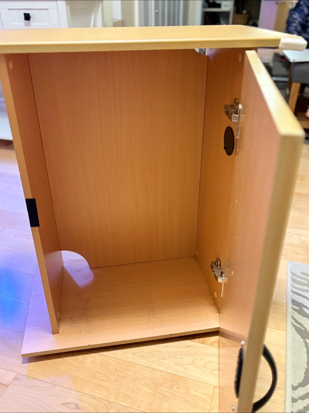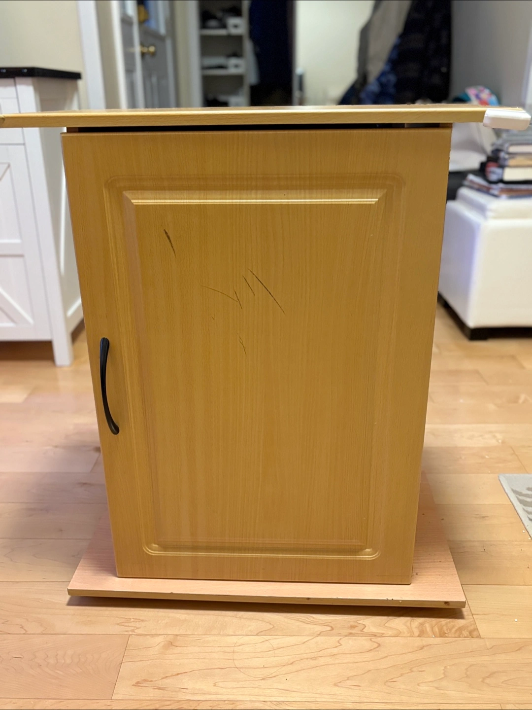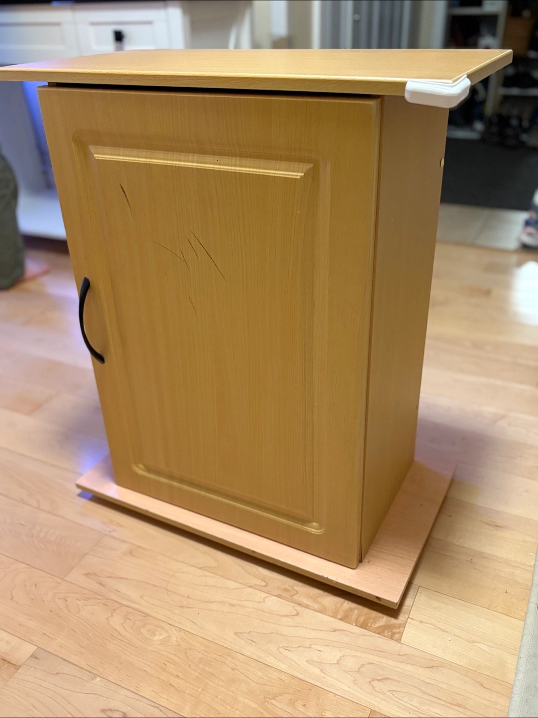 Light beige wooden aquarium fish tank. Single door, small interior space. Minor surface scratches.