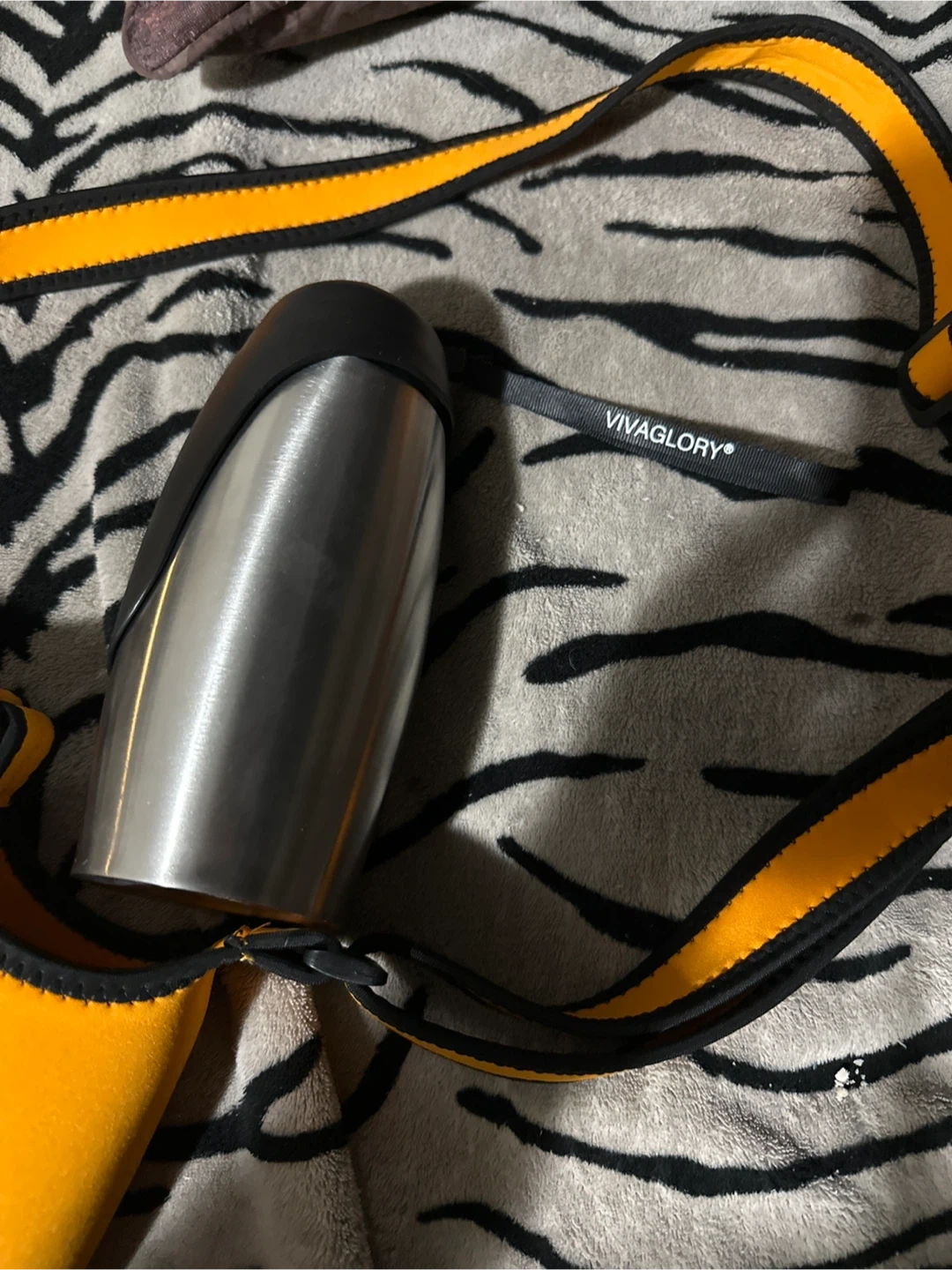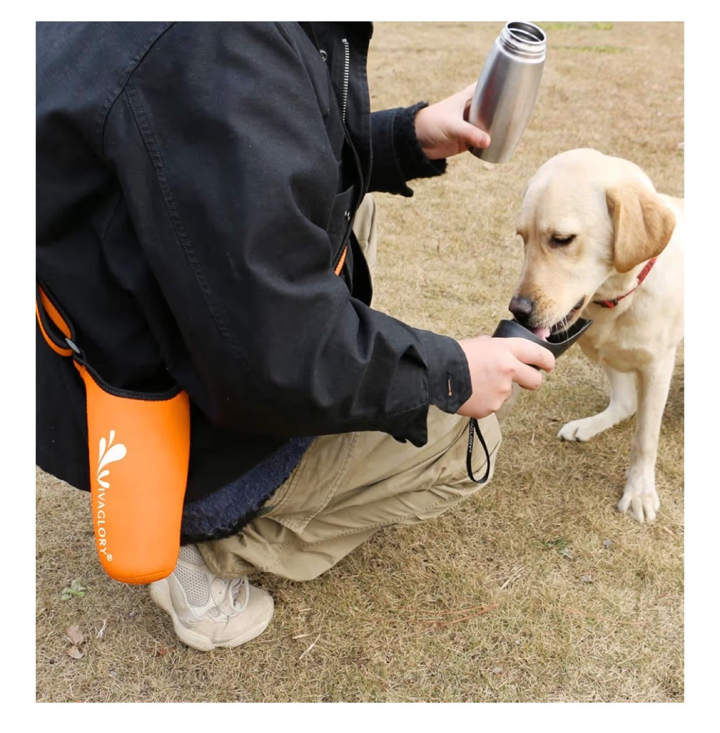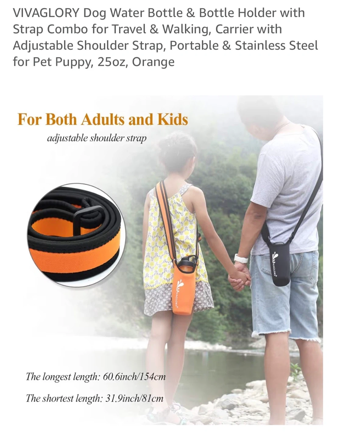 This VIVAGLORY dog water bottle and holder combo is perfect for travel and walking. It's made of food-grade stainless steel and has a larger capacity of 25oz. The set includes an orange bottle holder with an adjustable shoulder strap.