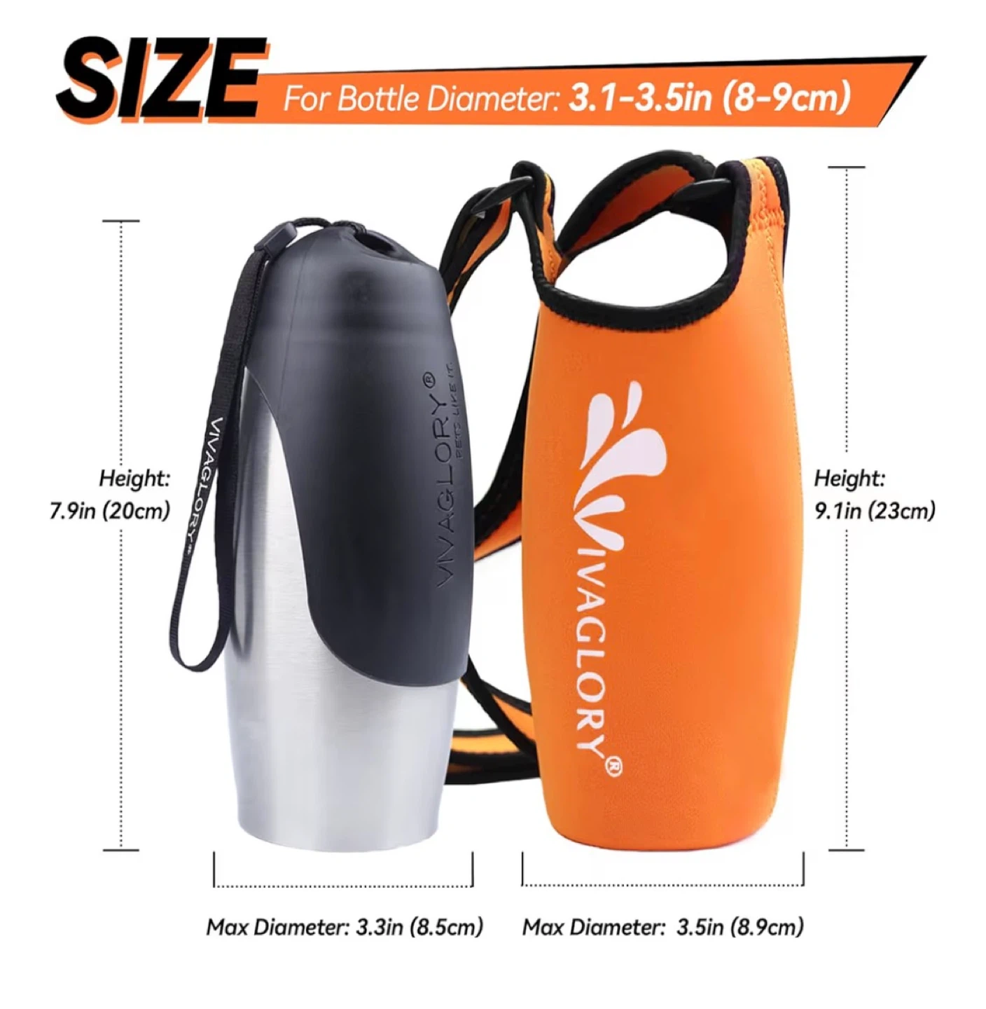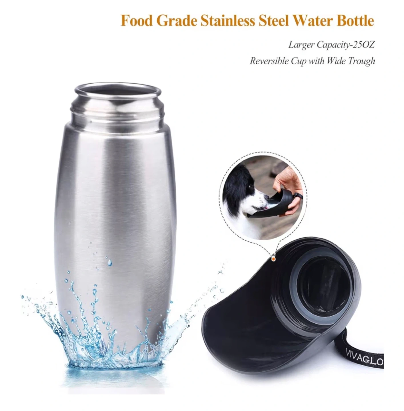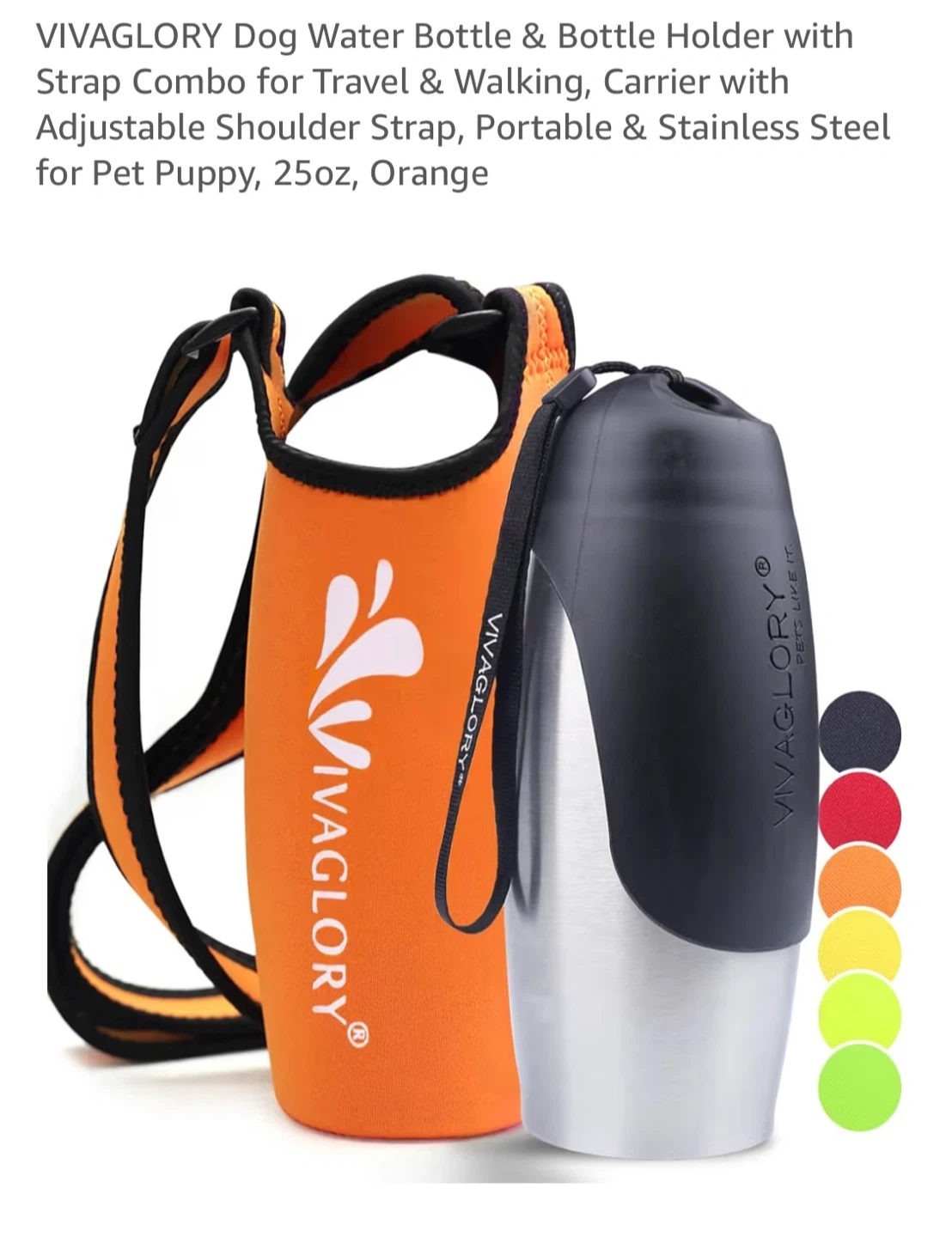 This VIVAGLORY dog water bottle and holder combo is perfect for travel and walking. It's made of food-grade stainless steel and has a larger capacity of 25oz. The set includes an orange bottle holder with an adjustable shoulder strap.