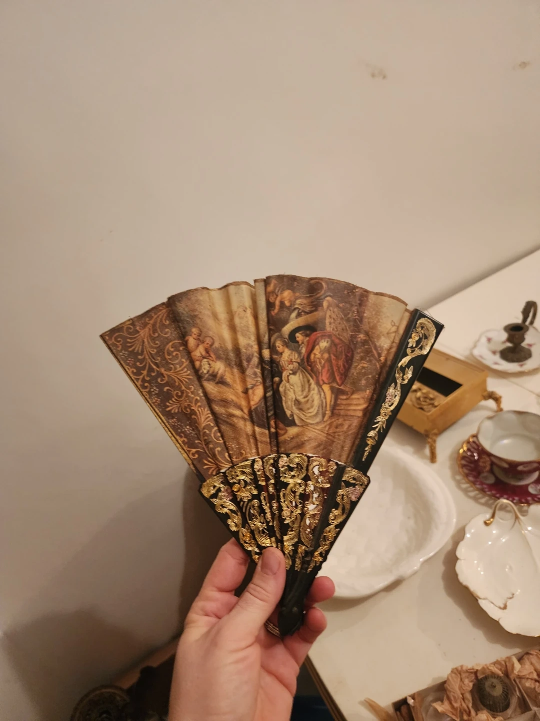 Selling a vintage hand fan with a beautiful Rubens painting design. It's a unique piece with intricate details and would be a great addition to any collection or as a decorative item