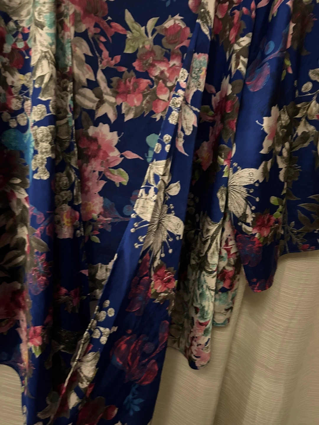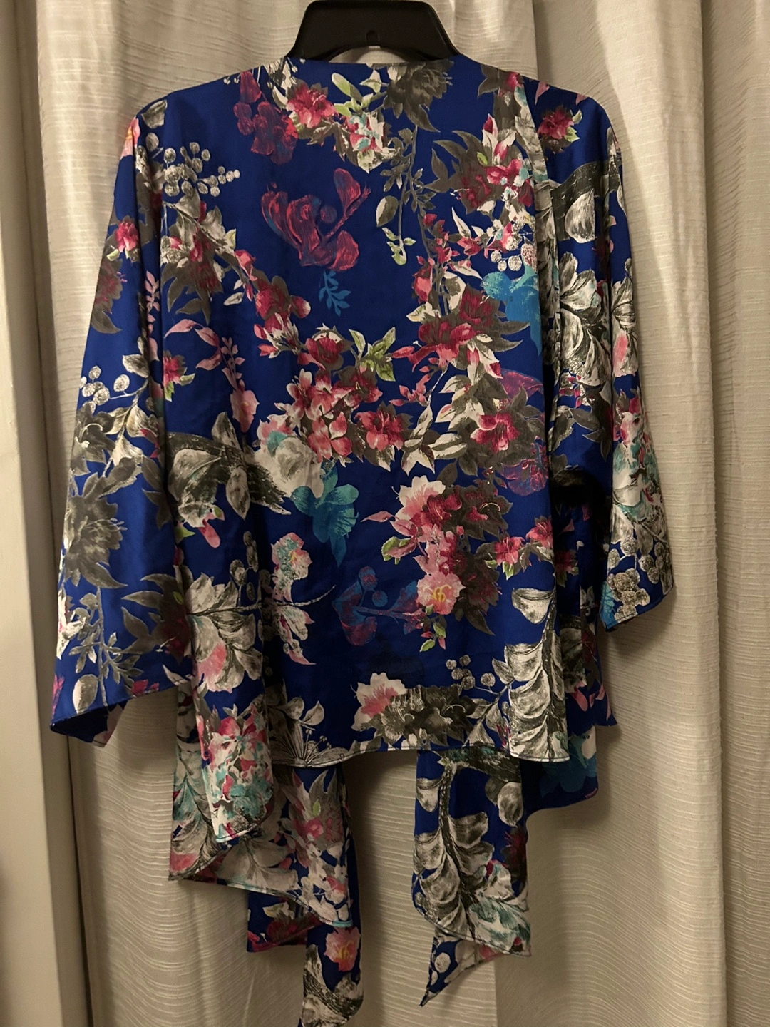 Beautiful cobalt blue floral print kimono. Three-quarter sleeves. Open front. Lightweight material. Self-tie closure.