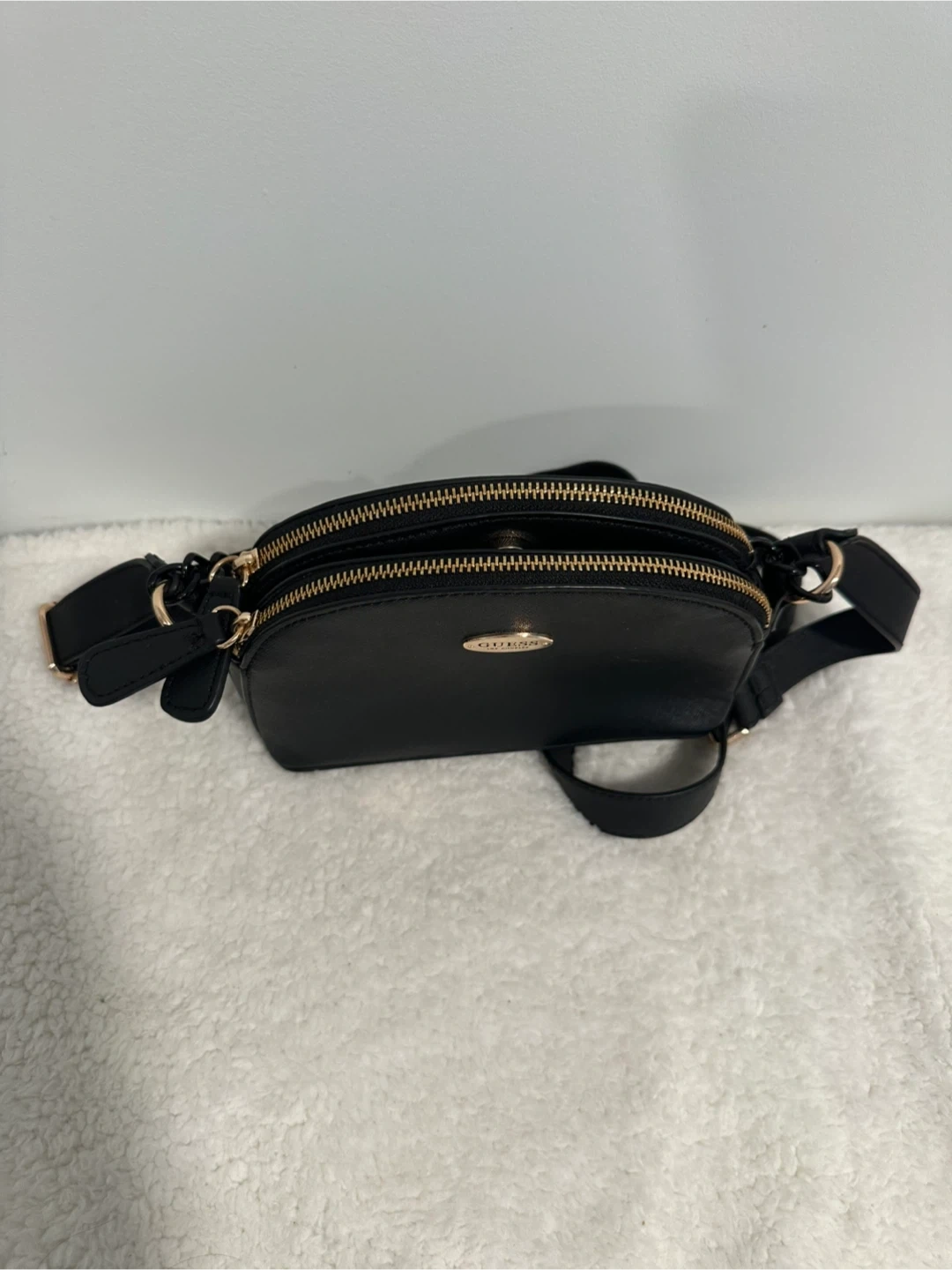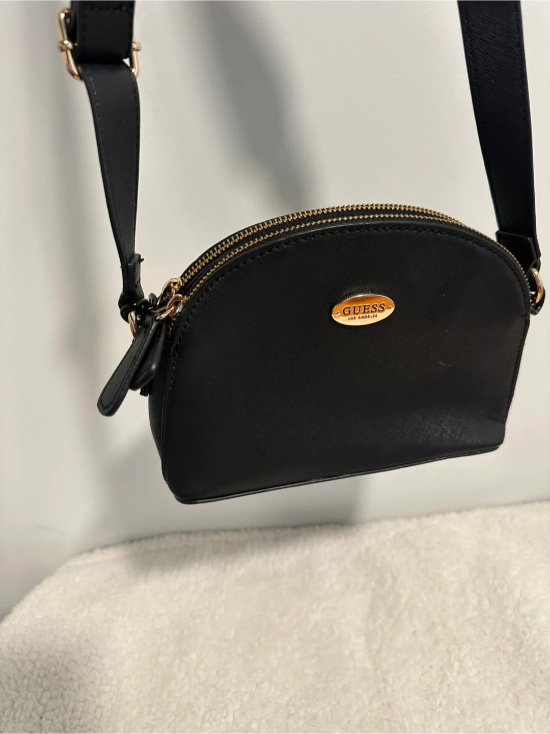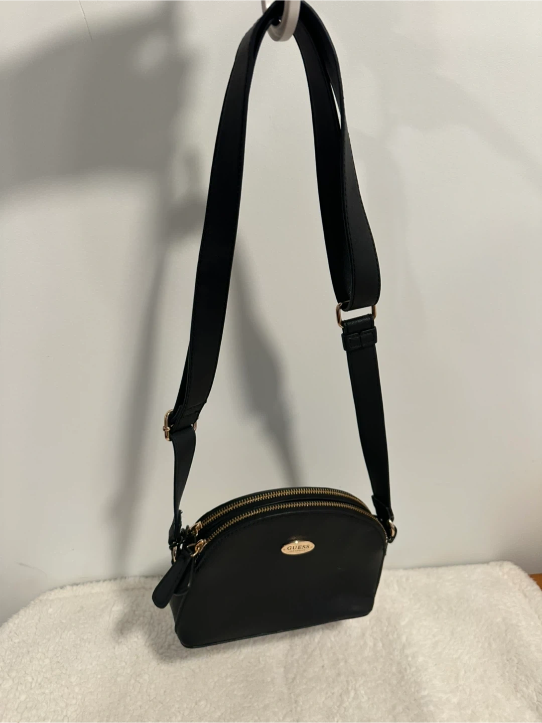 This is a black crossbody purse from GUESS. It features a sleek design with a convenient adjustable strap and stylish chain accents. The purse has dual zippered compartments to keep your essentials organized. It's made of durable faux leather.