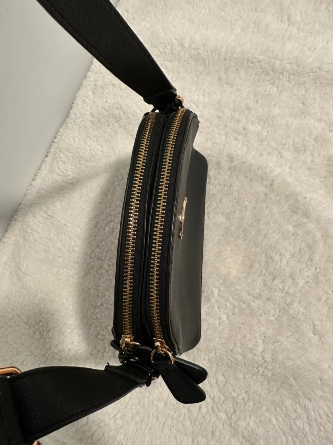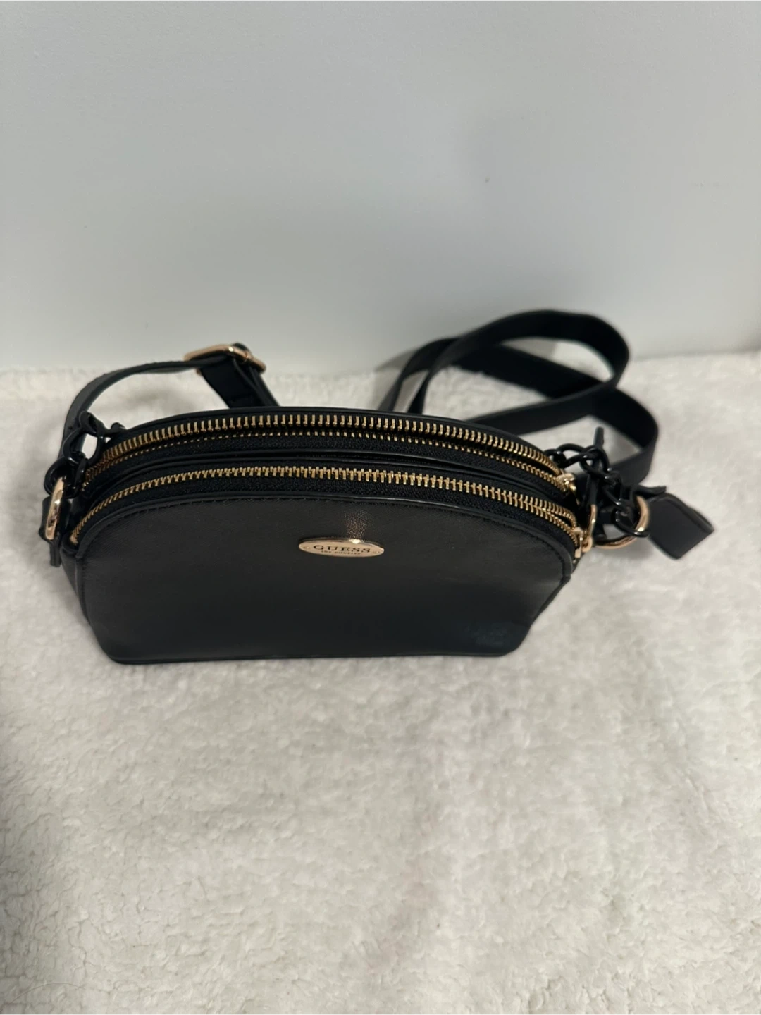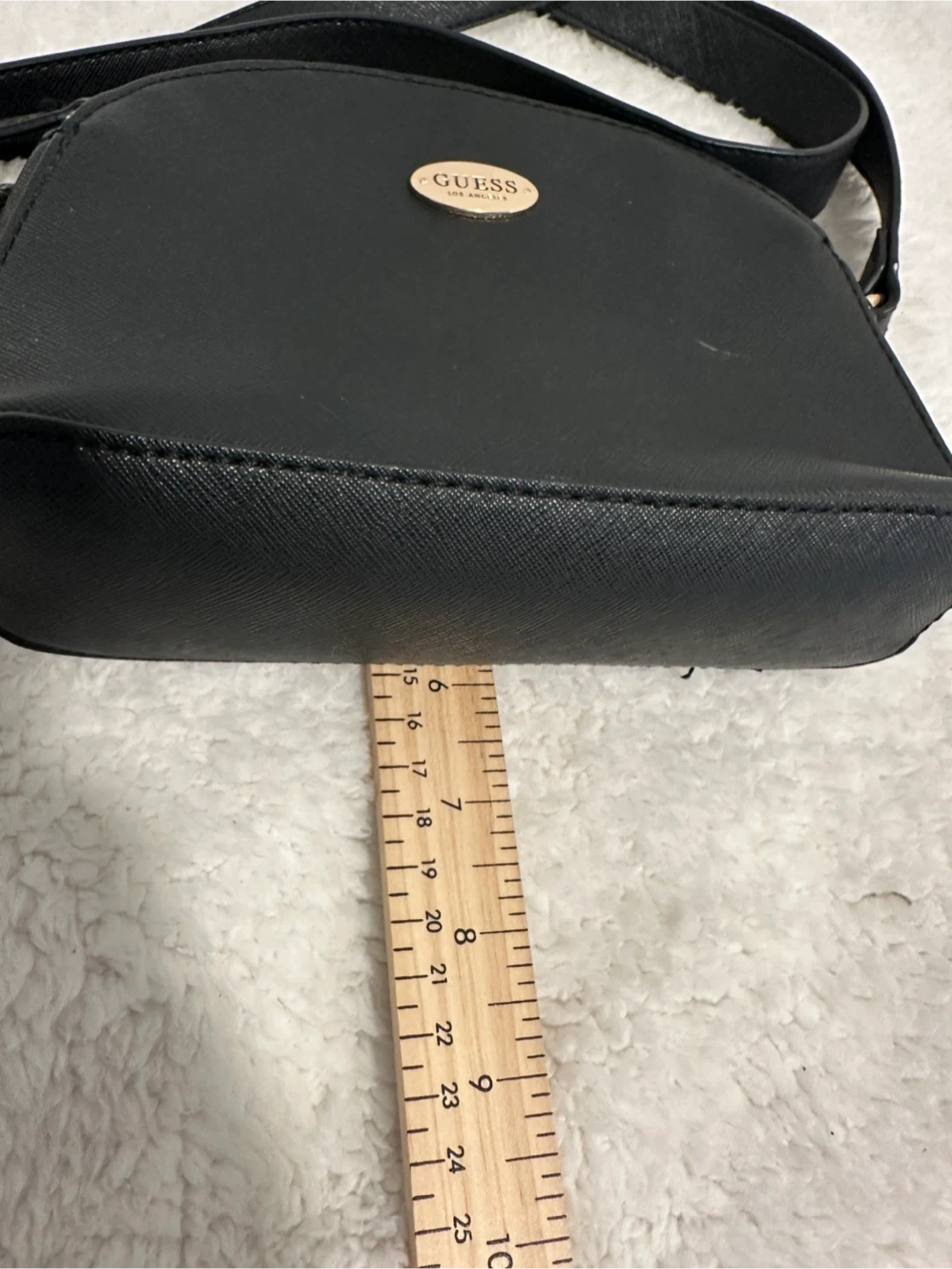 This is a black crossbody purse from GUESS. It features a sleek design with a convenient adjustable strap and stylish chain accents. The purse has dual zippered compartments to keep your essentials organized. It's made of durable faux leather.