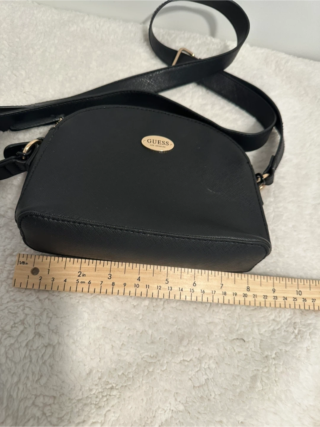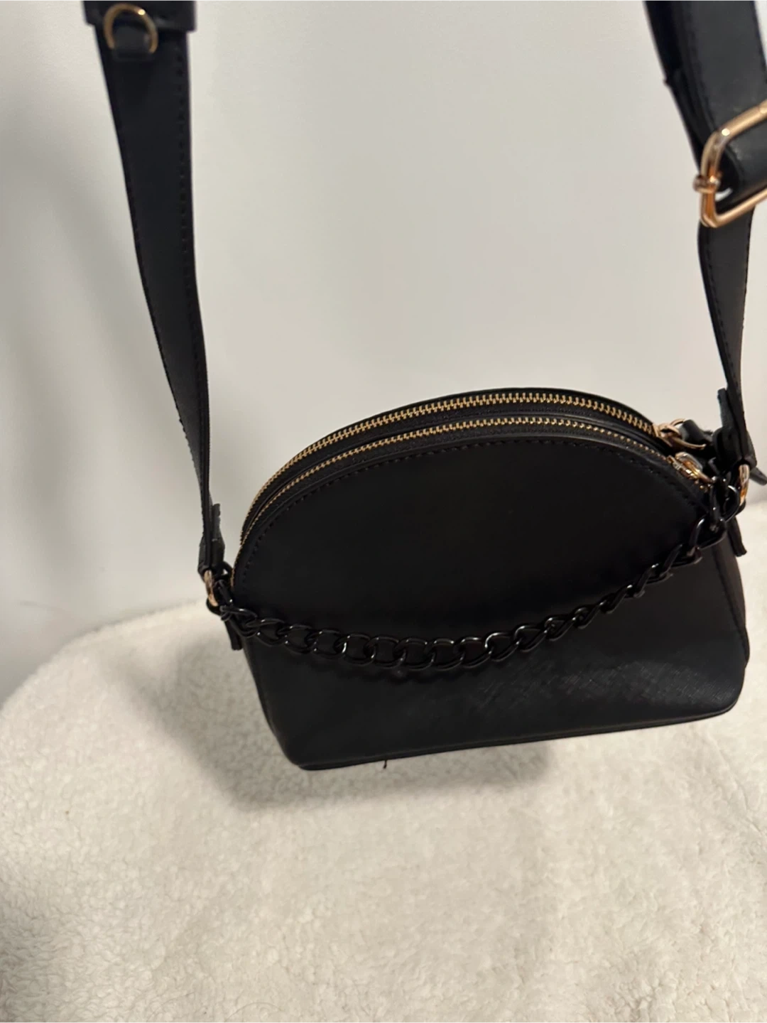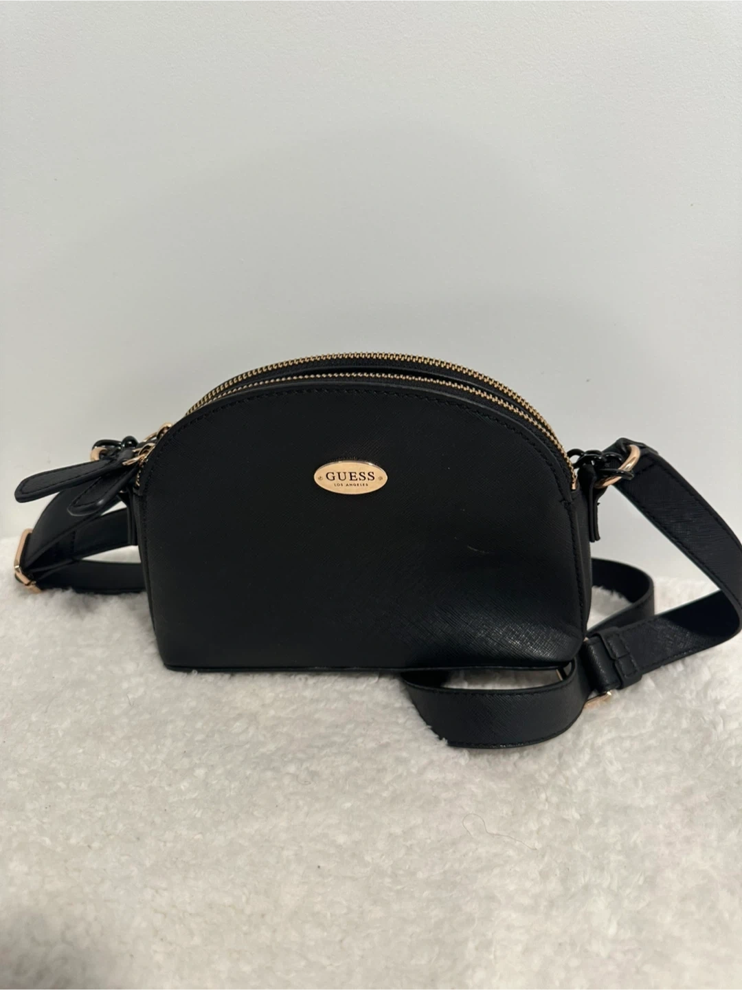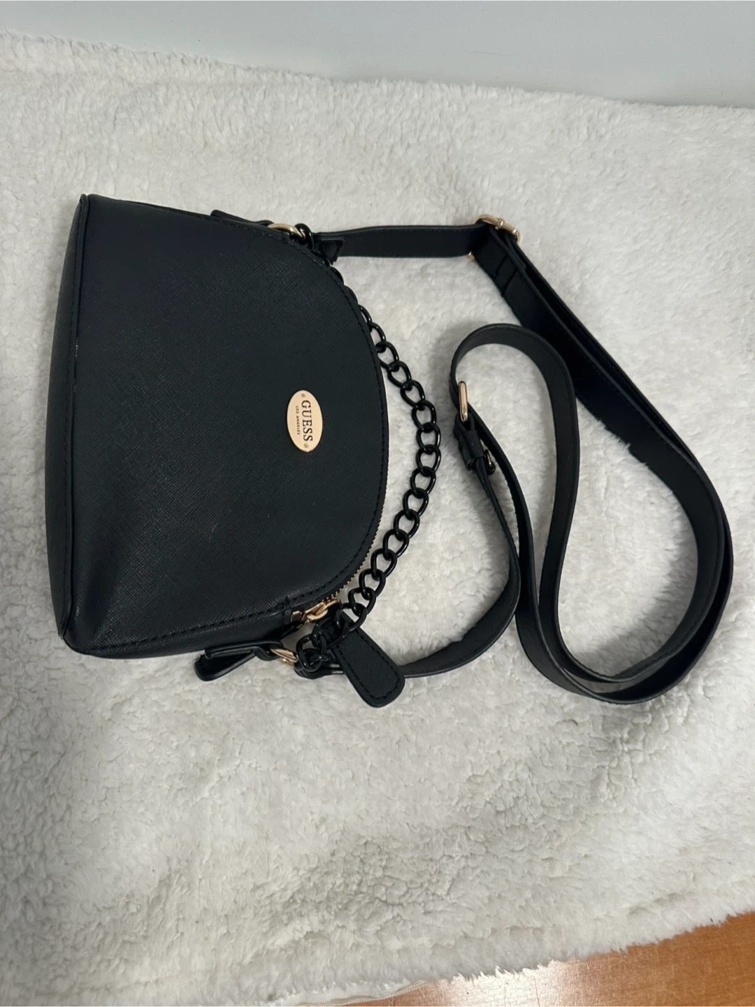 This is a black crossbody purse from GUESS. It features a sleek design with a convenient adjustable strap and stylish chain accents. The purse has dual zippered compartments to keep your essentials organized. It's made of durable faux leather.